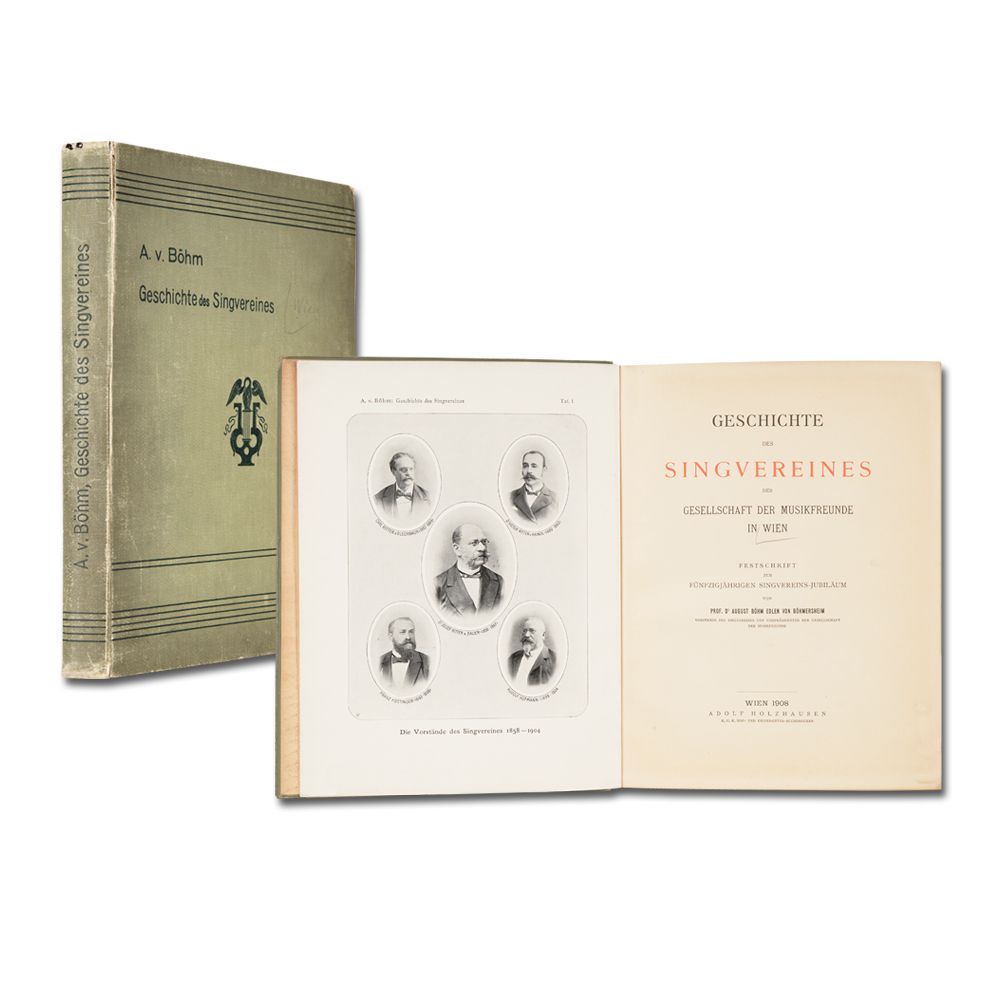 BÖHM, A. von: Geschichte des Singvereines der Gesellschaft der Musikfreunde in Wien. Festschrift zum fünfzigjährigen Singvereins-Jubiläum. Wien, A. Holzhausen 1908. Quart, XII, 183, (92) S. und VII Tafeln, wenige Anstreichungen OLn. (Gebrauchsspuren)