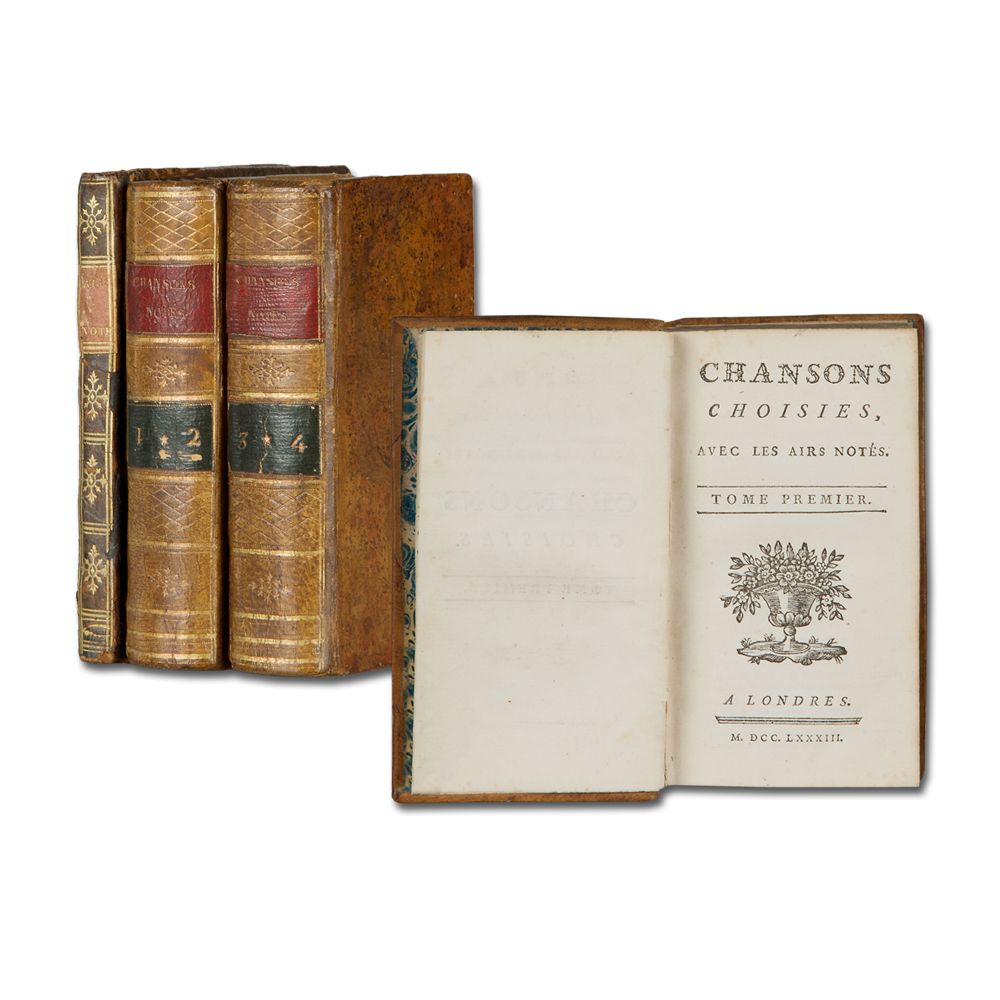 CHANSONS CHOISES avec les airs notés. 5 Bände in 3. Londres und Genéve 1783-84. Duodez. Band 1 vorderer Deckel etwas gelockert. Buntpapiervorsätze. Lederbände der Zeit mit Rückenvergoldungen. Bd. 5 (Noten) abweichend gebunden (restauriert).
