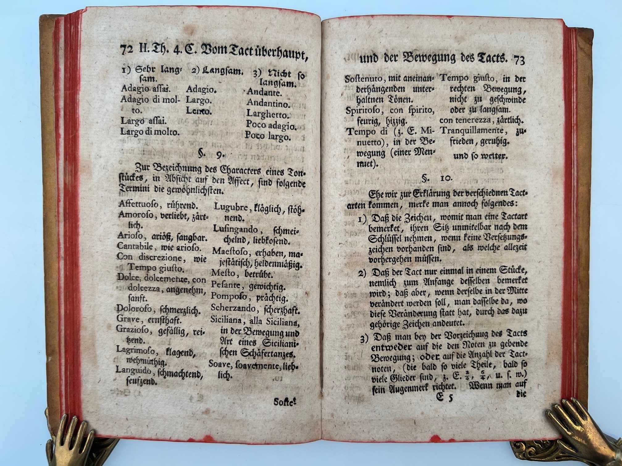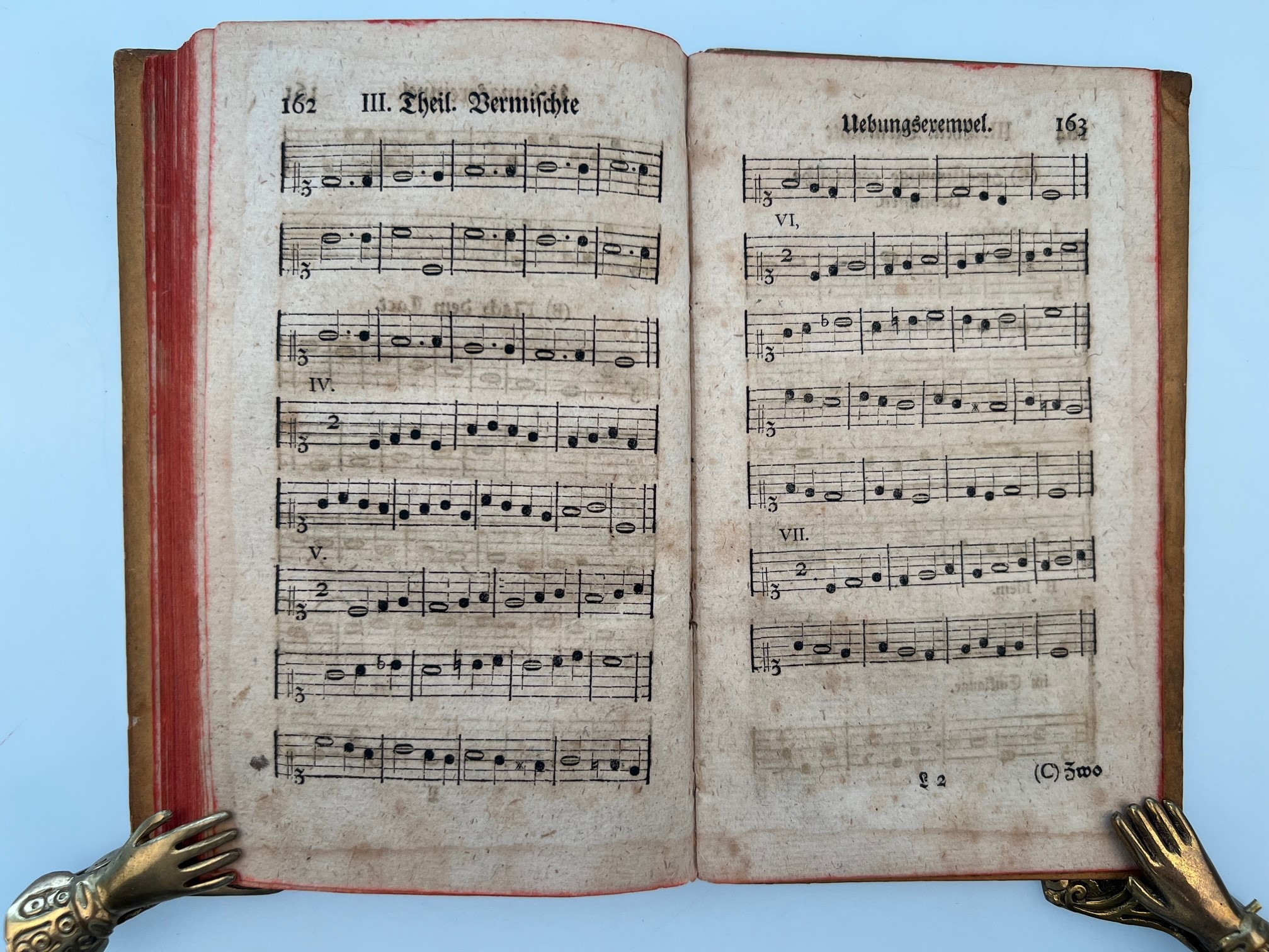 MARPURG, F. W.: Anleitung zur Musik überhaupt, und zur Singkunst besonders, mit Uebungsexempeln erläutert, und den berühmten Herren Musikdirect. und Cantoribus Deutschlands zugeeignet. Berlin A. Wever 1763 6 Bl., 171 S. Zahlreiche Notenbeispiele in Typendruck. Gebräunt, teils leicht stockfleckig. Vereinzelt schwach wasserrandig. Titelblatt mit Eintragungen von alter Hand und etwas knittrig. Einige Bl. gestempelt. Rotschnitt. Pappband der Zeit. Rücken unauffällig überklebt.