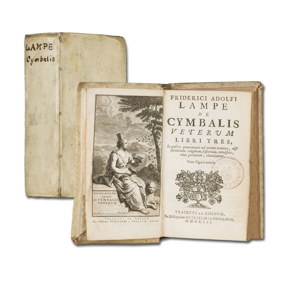LAMPE, F. A.: De cymbalis veterum libri tres, In quibus quaecunque ad eorum nomina, differentiam, originem, historiam, ministros, ritus pertinent, elucidantur. Cum figuris aeneis. Trajecti ad Rhenum [= Utrecht], Guilielmi a Poolsum 1703. Kleinoktav. Kupfertitel als Frontispiz, 13 Bl, 405 S., 21 Bl. und 9 [von 10] Kupfern. Titel, 1 Bl. und hinterer Vorsatz gestempelt. Exlibris und alte Marginalien im Vorsatz. Wenige Blatt fleckig bzw. wasserrandig. Pergamentband der Zeit.