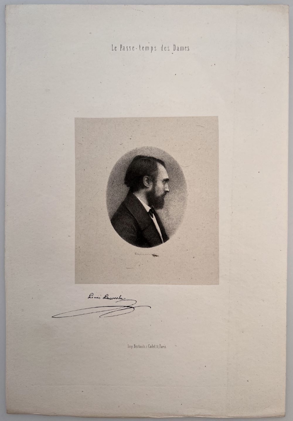 LACOMBE, Louis. - Portrait. Porträt, Halbfigur, Brustbild nach rechts im Oval mit der lithografierten Unterschrift von Louis Lacombe. Lithographie von Imp. Berlauts. Paris Imp. Berlauts, rue Cadet 11 [ca. 1870] 11,9 x 10,2 cm.