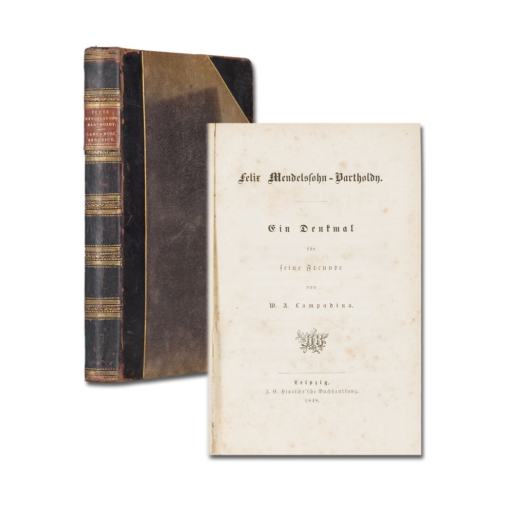 Sehr seltene erste Ausgabe der 1.(!) Mendelssohn-Biographie mit authentischer Darstellung aus dem engen Freundeskreis, nur wenige Monate nach dem Tode des Komponisten erschienen, eine ganz auf Mendelssohns Leipziger Werke konzentrierte Darstellung. - Der Autor weist ausdrücklich darauf hin, dass er bei den meisten von Mendelssohns 'Leistungen auf dem Gebiete der Kunst gegenwärtig und häufig selbst unter den Ausübenden und Mitwirkenden war' und er 'das Glück hatte, mehrfach in persönliche Berührung mit ihm zu kommen.