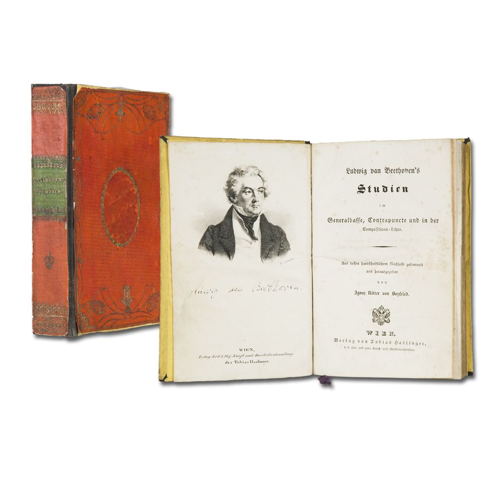 BEETHOVEN, L. v.: Studien im Generalbasse, Contrapunkte und in der Compositions-Lehre. Aus dem handschriftlichen Nachlasse gesammelt und hrsg. von I. Ritter von Seyfried. Wien T. Haslinger (1832). Porträt, XX S., 2 Bl., 352, 144 S., 2 Handschriften-Faksimiles, 2 Tafeln. Teils stockfleckig. Goldschnitt. Halbleinenband mit aufgezogenem zeitgenössischem Buntpapier mit Rücken- und Deckelvergoldungen.