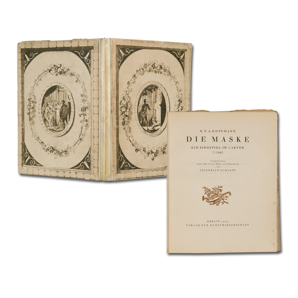 HOFFMANN, E. T. A.: Die Maske. Ein Singspiel in 3 Akten (1799). Aufgefunden und zum ersten Male veröffentlicht von F. Schnapp. Berlin Verlag für Kunstwissenschaft 1923. Quart. 4 Bl. 150 S. 5 Faksimiles, 2 Tafeln nach Stichen. 32 S. Notenbeispiele aus der Partitur (als Klavierauszug mit Singstimmen). Original Halbpergamentband mit Rückenvergoldung und Lichtdruck-Faksimiles in Originalgröße nach Hoffmanns Zeichnungen des Textbuches auf den Deckeln.
