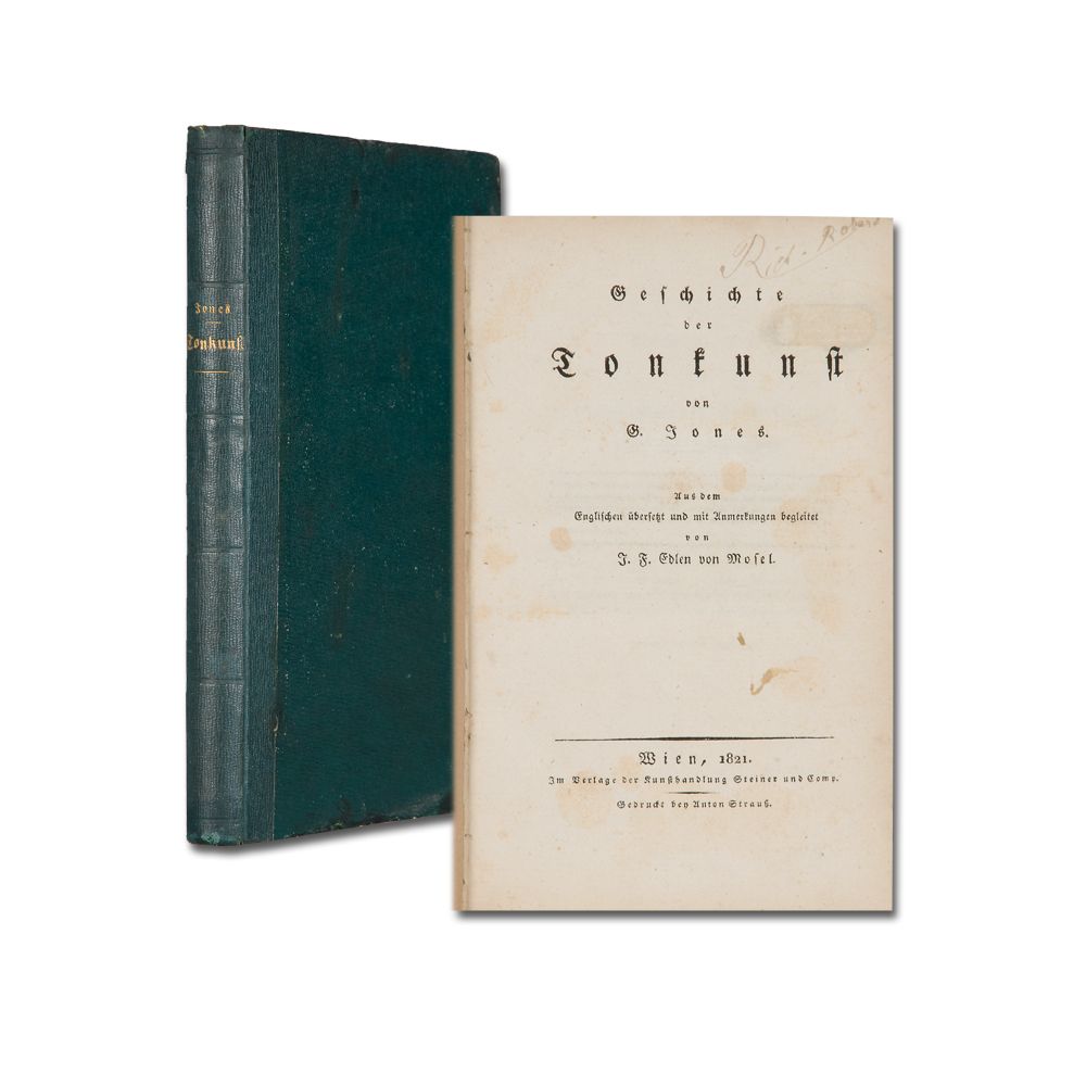 JONES, G.: Geschichte der Tonkunst. Aus dem Englischen übersetzt und mit Anmerkungen begleitet von J.F.E. v. Mosel. Wien Steiner 1821 4 Bl., XVIII, 227 S. Halbleinenband.