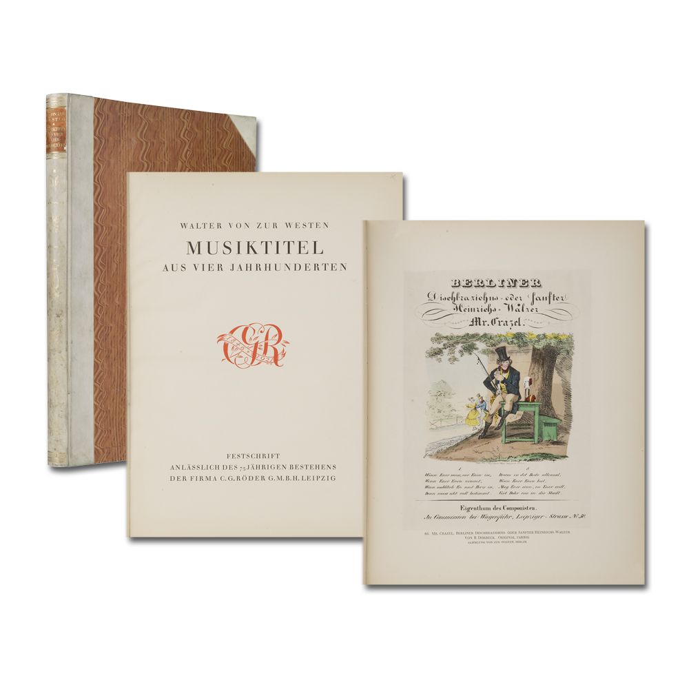 Wichtiges Werk über ein wenig beachtetes, reizvolles Sammelgebiet: die bildliche Darstellung auf Titelblättern von Musikalien. Luxuriöse Festschrift der Notendruckerei C. G. Röder.