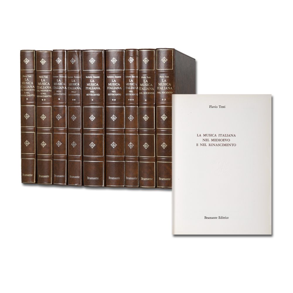 Flavio Testi: La Musica Italiana nel Medioevo e nel Rinascimento (2 Bände). Nel Seicento (2 Bände). Roberto Zanetti: Nel Settecento (3 Bände); Vincenzo Terenzio: Nel Ottocento (2 Bände). - Die Ausgaben von Zanetti und Terenzio sind nummerierte Exemplare.