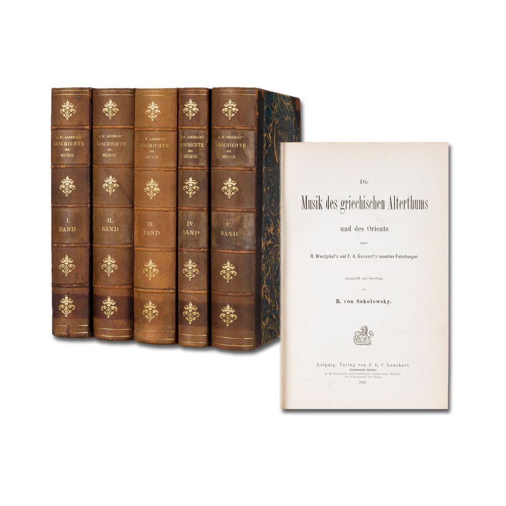 AMBROS, A. W.: Geschichte der Musik. Mit zahlreichen Notenbeispielen und Musikbeilagen. 2./3. vermehrte und verbesserte Auflage. 5 Bände Leipzig Leuckart 1881-1893 Zahlreiche Notenbeispiele und Musikbeilagen. Titel gestempelt. Lederbände der Zeit. Ecken und Kanten bestoßen, sonst ordentliche Exemplare.