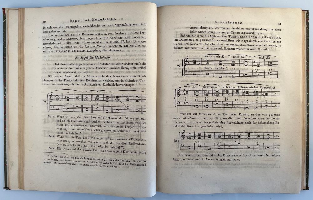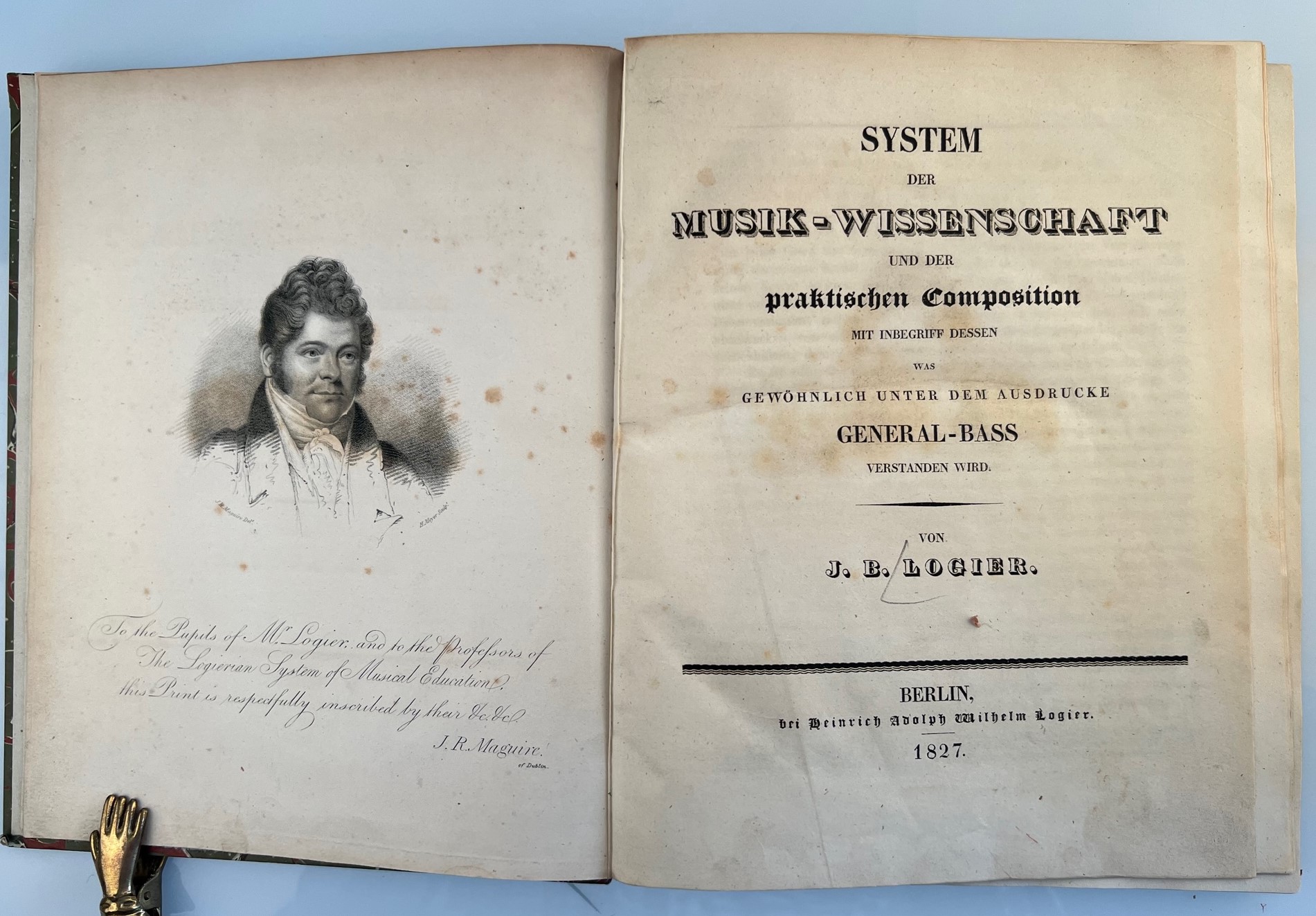LOGIER, J. B.: System der Musik-Wissenschaft und der praktischen Composition mit Inbegriff dessen was gewöhnlich unter dem Ausdrucke General-Bass verstanden wird. Berlin H. A. W. Logier 1827 Quart. Gestochenes Portrait als Frontispiz, XI S., 2 Bl., 346 S., zahlreiche Notenbeispiele im Text. Pappband im Stil der Zeit.