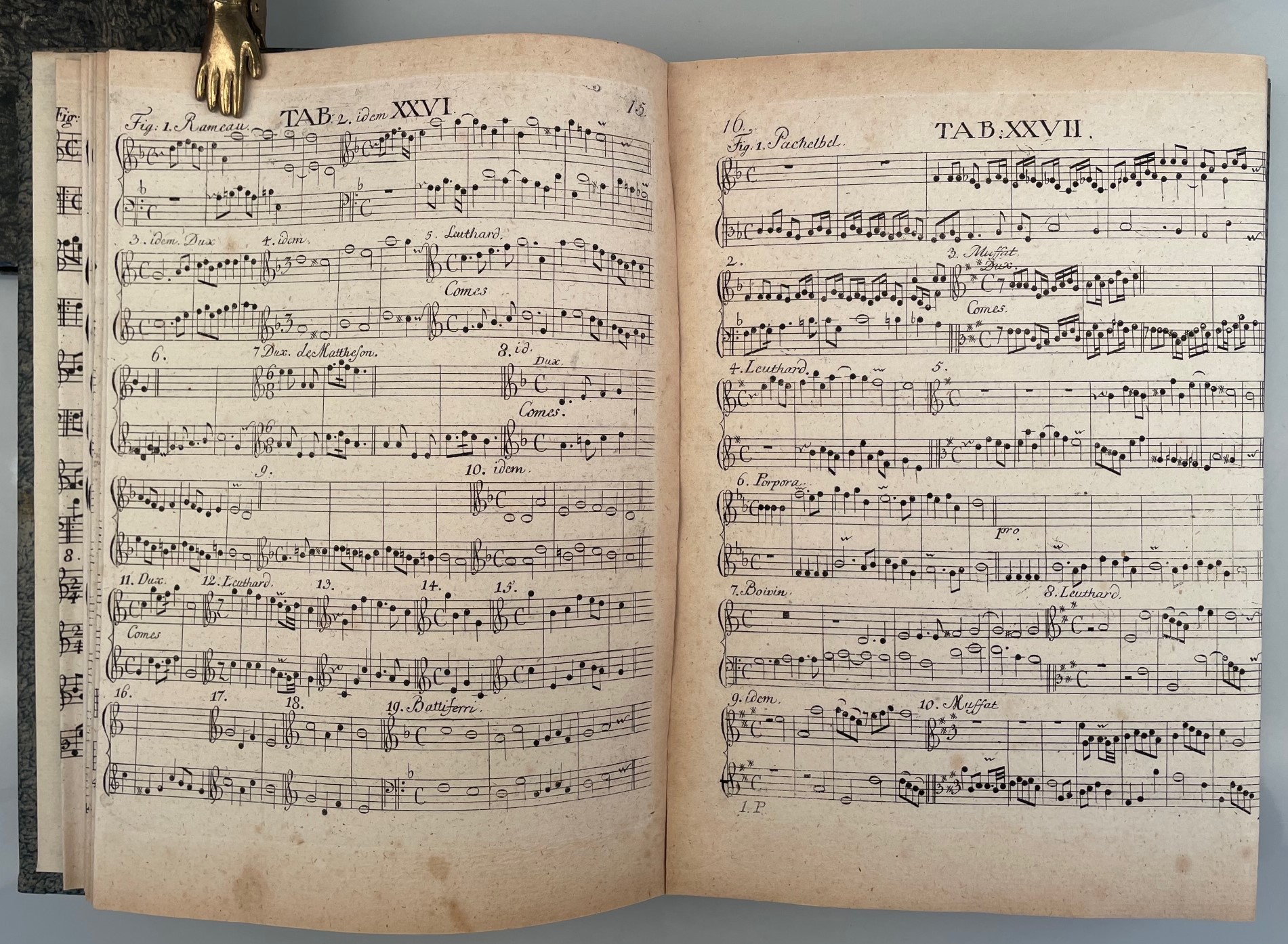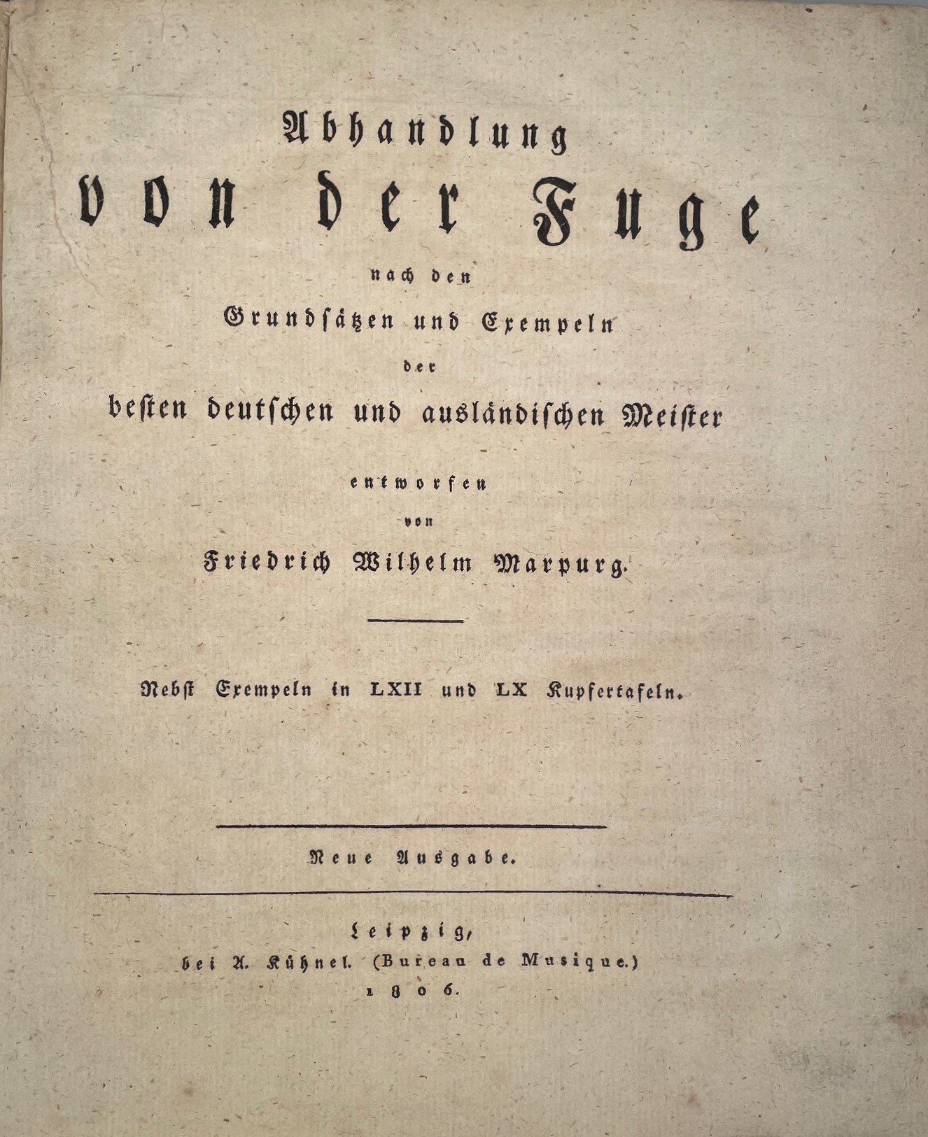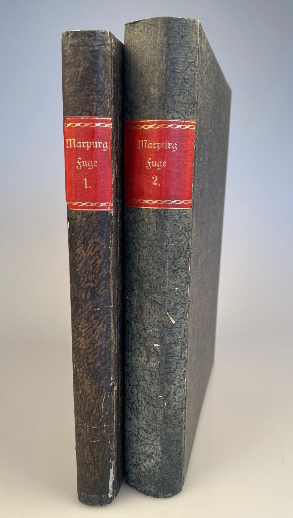 MARPURG, F. W.: Abhandlung von der Fuge nach den Grundsätzen und Exempeln der besten deutschen und ausländischen Meister entworfen. Nebst Exempeln in LXII und LX Kupfertafeln. Neue Ausgabe. 2 Teile in 2 Bänden. Leipzig, A. Kühnel 1806; Bd. 2: C. F. Peters Bureau de Musique [nach 1814]. Quart. VII, 120 S.; 92 S., 3 Bl. Register, Verbesserungen und Verlagsverzeichnis; 122 Notenbeispiele auf 63 S. Kupfertafeln. Alte Notizen im Vorsatz. Einriss im Titel von Bd. 1 sauber repariert, Bd. 2 anfangs wasserrandig, sonst sehr schönes Exemplar auf stärkerem Papier. Pappband der Zeit und Bd. 2 Pappband mit zeitgenössischem Buntpapier.