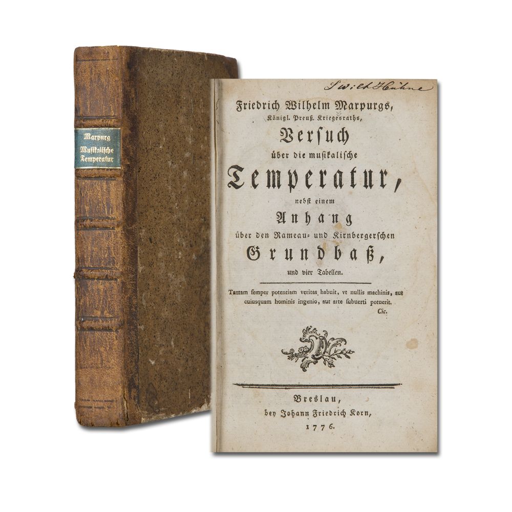 MARPURG, F. W.: Versuch über die musikalische Temperatur, nebst einem Anhang über den Rameau- und Kirnbergerschen Grundbass. Breslau, J.F. Korn 1776. XVI S., 1 Bl., 319 S. 4 gefaltete Notenkupfer. Alter Name auf Titel. Titelblatt partiell mit altem Papier hinterlegt. Halblederband der Zeit mit neuem RSchild im Stil d. Zt. Berieben und vorderer Deckel rechts unten mit fehlender Lederecke.