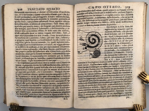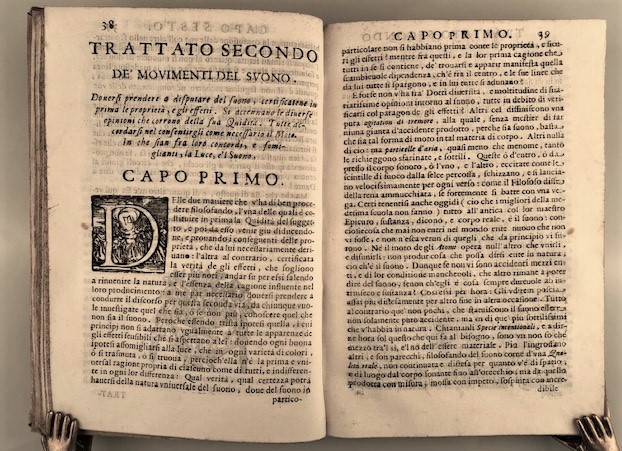 BARTOLI, D.: Del suono de'tremori armonici e dell'udito. Rom N. A. Tinassi 1679 8 Bl., 330 S., 1 Bl. Register (auf altem Papier faksimiliert). 5 Holzschnitt-Initialen, 21 Holzsschnitte im Text. Pergamentband der Zeit.