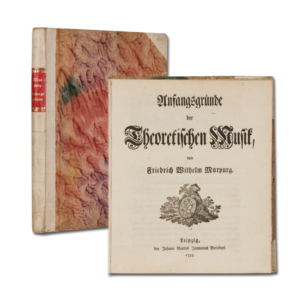 MARPURG, F. W.: Anfangsgründe der Theoretischen Musik. Leipzig J. G. I. Breitkopf 1757 Quart. 4 Bl., 176 S. Makelloses Exemplar. Halbpergamentband der Zeit.