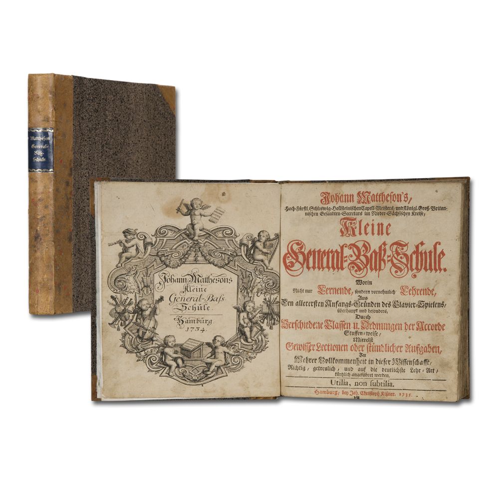 MATTHESON, J.: Kleine General=Bass=Schule. Worin Nicht nur Lernende, sondern vornehmlich Lehrende, Den allerersten Anfangs=Gründen des Clavier=Spielens ... Durch Verschiedene Classen u. Ordnungen der Accorde Stuffen=weise, Mittelst Gewisser Lectionen oder stündlicher Aufgaben Zu Mehrer Vollkommenheit ... angeführet werden. [FIRST EDITION]. Hamburg bey Joh. Christoph Kissner 1735 Klein-Quart. 8 Bl. (inkl. Fontispice, dat. 1734 und Titel in rot/schwarz), 235 S. mit Abbildungen und vielen Notenbeispielen in Holzschnitt, 6 Bl. Papierbedingt etwas gebräunt Halblederband im Stil der Zeit mit Leder der Zeit und Buntpapier im Stil der Zeit.