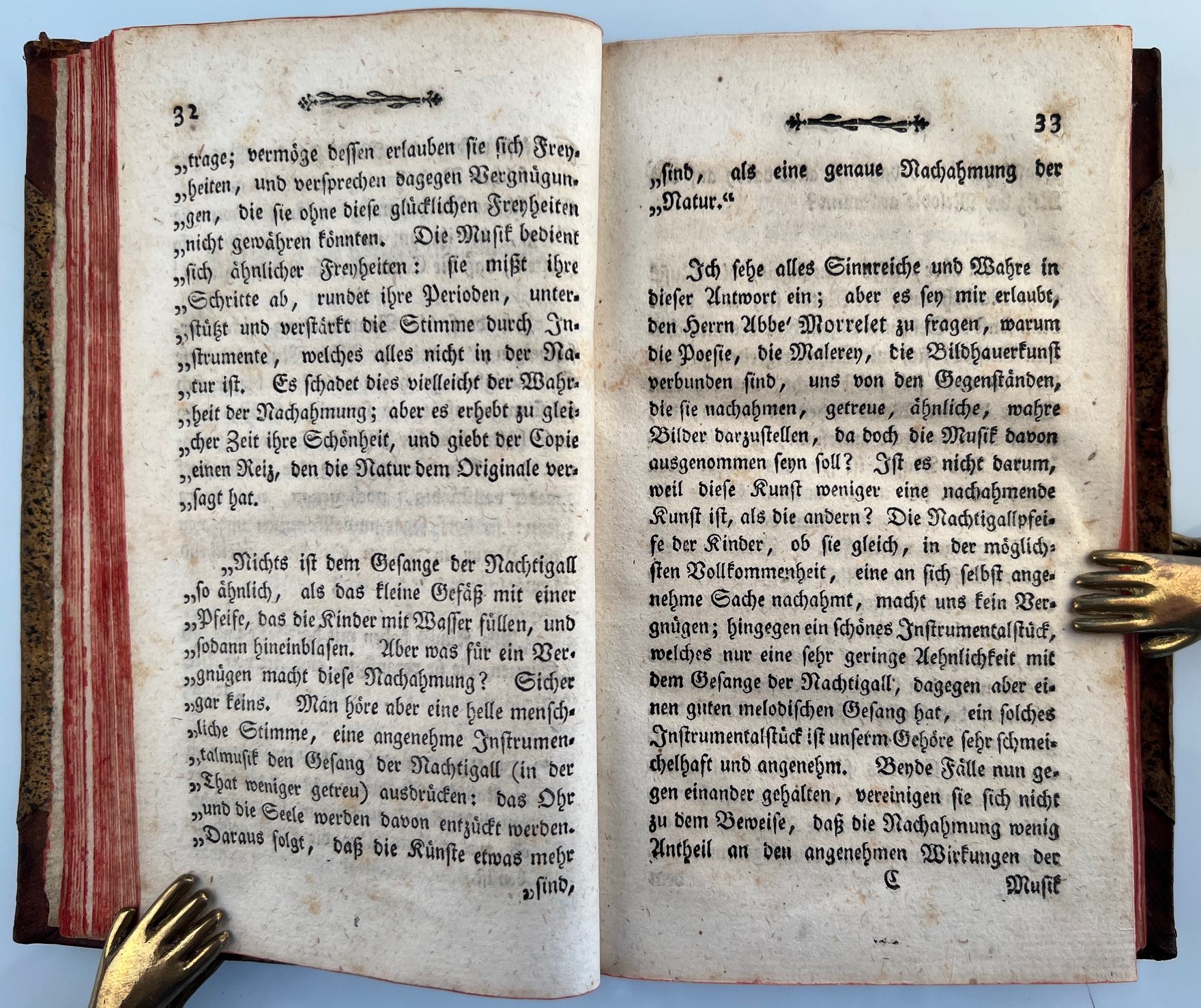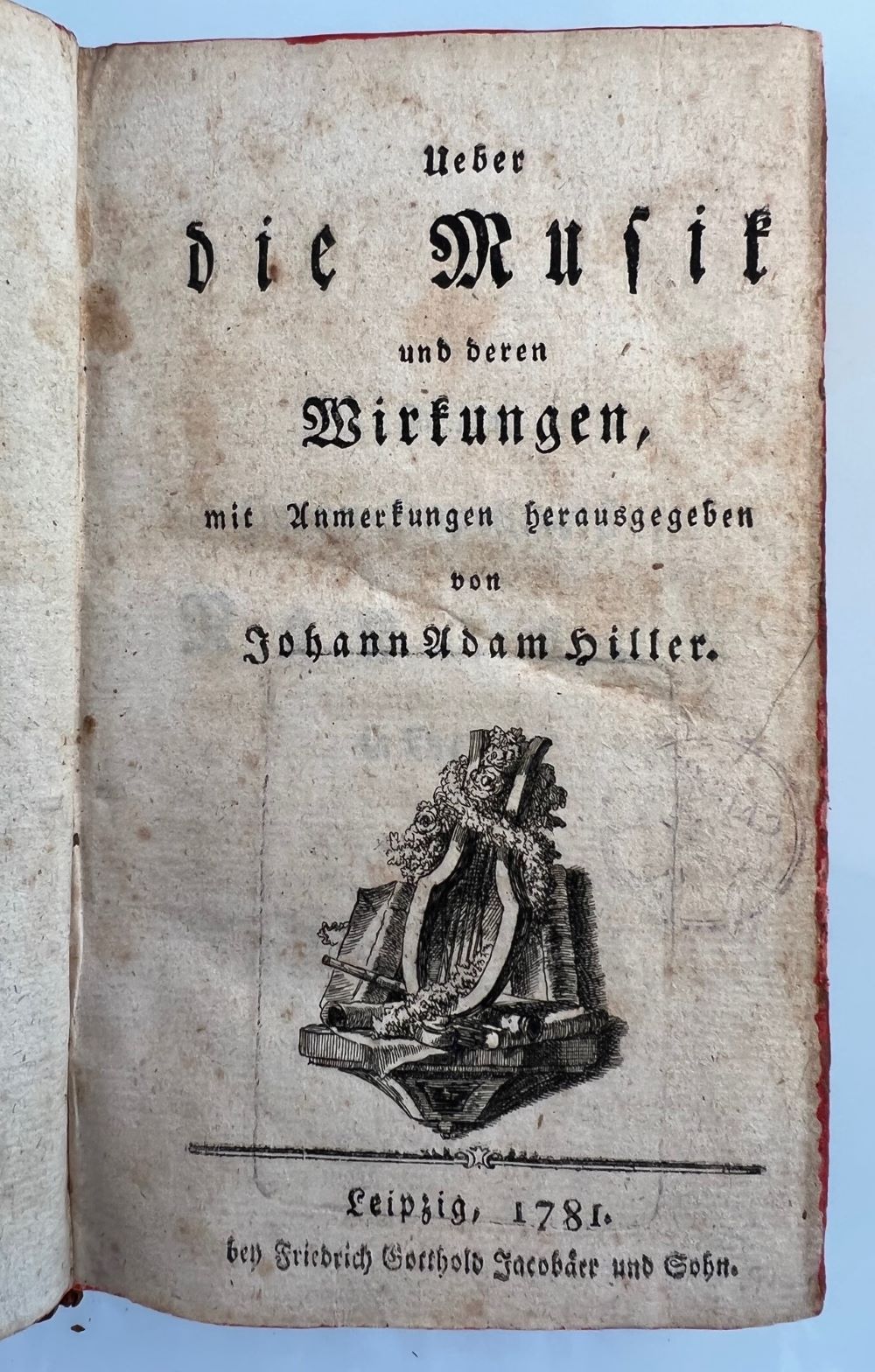 HILLER, J. A.: Ueber die Musik und deren Wirkungen, mit Anmerkungen herausgegeben. Leipzig Jacobäer u. Sohn 1781 Gestochene Titelvignette, XXVIII, 228 S. Eintragungen von alter Hand im Vorsatz. Rotschnitt. Gutes Exemplar. Halblederband der Zeit. Rückenschild erneuert.