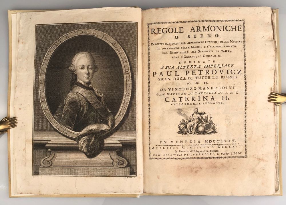 MANFREDINI, V.: Regole armoniche o sieno precetti ragionati per apprendere i principij della musica, ... e l'accompagnamento del basso sopra gli strumenti da tasto, come l'organo, il cembalo ec. Venedig G. Zerletti 1775 Groß-Quart. XVI, 78 S., 1 Bl. Mit gestochenem Porträt (zeigt Paul Petrovicz), gestochener Titelvignette, 20 gefalteten Notenkupfern und mehreren, teils ganzseitigen Notenstichen im Text. Sehr breitrandig und unbeschnitten, nur minimal stockfleckig. Titel mit gelöschtem Besitzvermerk. Exlibris im Vorsatz. Pergamentband im Stil der Zeit