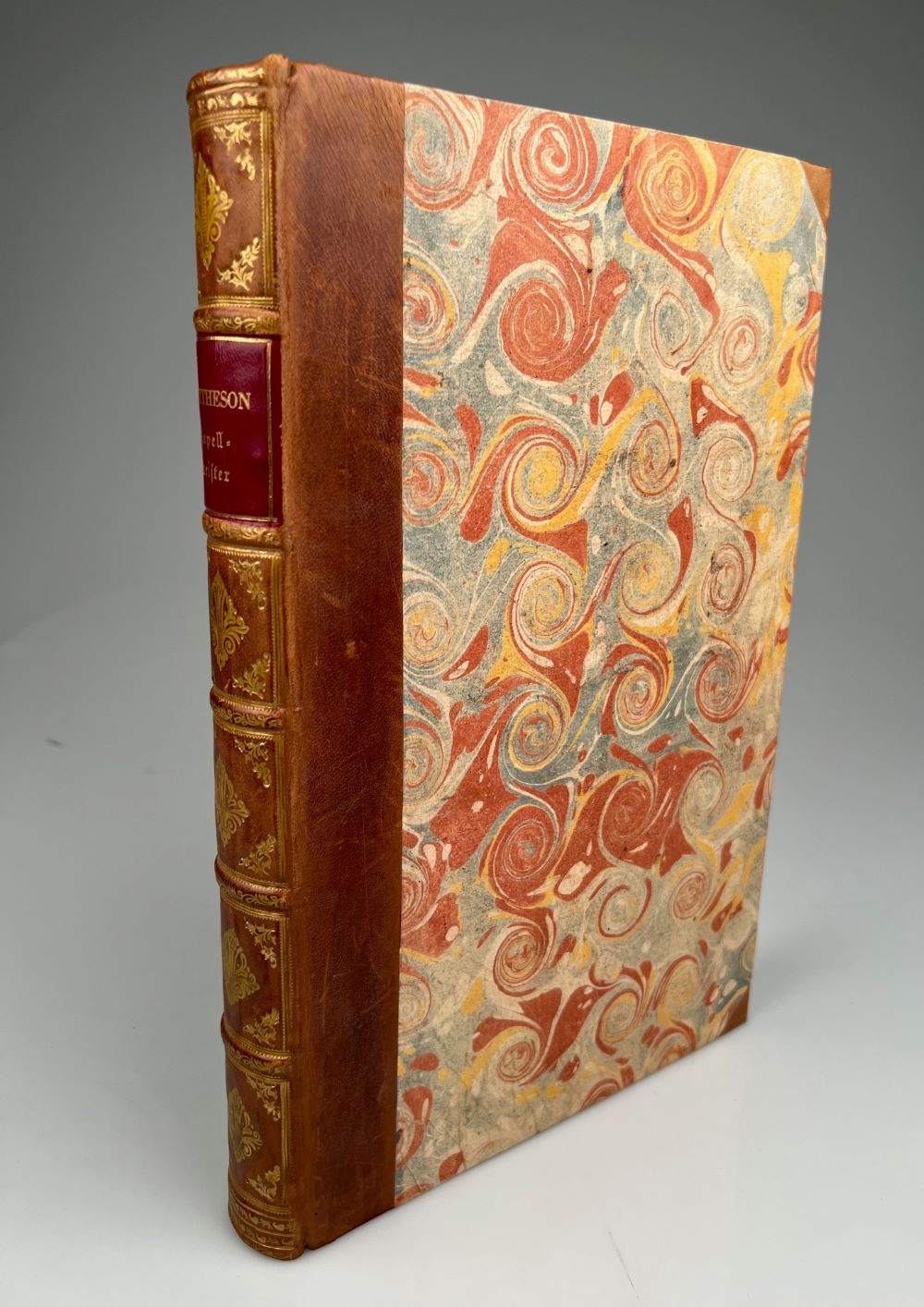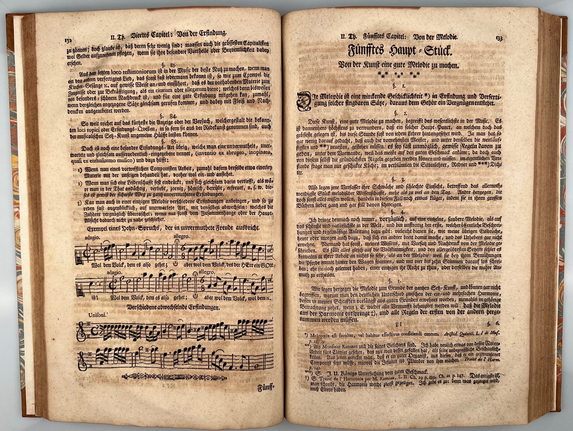 MATTHESON, [J.]: Der Vollkommene Capellmeister. Das ist Gründliche Anzeige aller derjenigen Sachen, die einer wissen, können, und vollkommen inne haben muss, der eine Capelle mit Ehren und Nutzen vorstehen will: Zum Versuch entworffen. Hamburg Christian Herold 1739 Quarto. 28 pp. (incl. title), 2 pp, 484 pp, 11 pp, with engraved title vignette., 1 full-page copperengraving (p. 374) and many music examples in the text. Browned throughout as are almost all copies of this work. The first page of the Emmendada printed twice, but still without "Neues Verzeichnis bisheriger Matthesonischer Wercke", which was facsimiled and bound in as an additional 11th leaf recto.Quart. 28 S. (inkl Titel), 2 Bl., 484 S., 11 Bl., mit gest. Titelvign., 1 ganzseitigem Kupfer (S. 374) und vielen Notenbeispielen im Text. Durchgehend gebräunt wie fast alle Exemplare dieses Werks. Die erste Seite der Emmendada doppelt gedruckt, dafür noch ohne "Neues Verzeichnis bisheriger Matthesonischer Wercke", das als zusätzliches 11. Blatt recto faksimiliert und beigebunden wurde. Beautiful half leather binding in contemporary style with rich period spine gilt and contemporary colored paper.