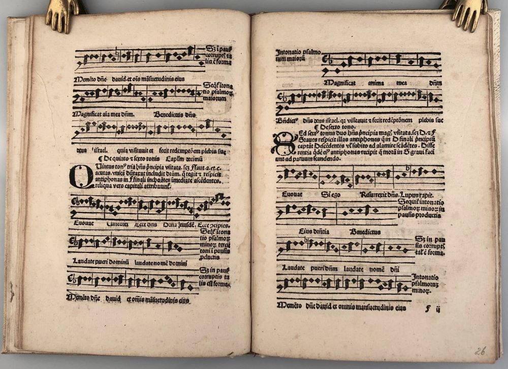 WOLLICK, N.: Opus Aureum. Music castigatissimum de Gregoriana et figuratina atque contrapuncto simplici percomode tractans omnibus cantu oblectantibus vtile et necessarium e diuersis excerptum. (Köln, H. Quentell 1505) Quart. 39 ungez. Blatt. Mit zahlreichen Notenbeispielen und Tabellen, sowie der ganzseite Holzschnitt der Guidonischen Hand. 1 Bl. angerändert (ohne Textverlust). Vereinzelt Marginalien von alter Hand. Wenige Bl. im Falz leicht wasserrandig. Teils etwas gebräunt. Schöner kräftiger Abzug. Pergamentband im Stil der Zeit.