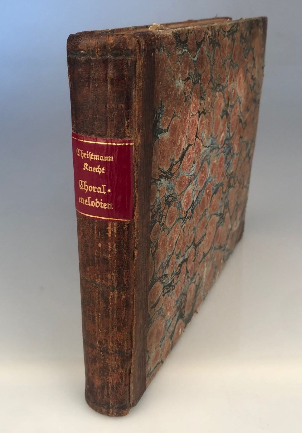 CHRISTMANN, [J. F.] und [J. H.] KNECHT: Vollständige Sammlung theils ganz neu componirter theils verbesserter vierstimmiger Choralmelodien für das neue Wirtembergische Landgesangbuch. Zum Orgelspielen und Vorsingen ... Nebst einer zweckmäßige Einleitung; in zehen Rubriken eingetheiltem Register; ... Hrsg. von Christmann und Knecht. Stuttgart, im Gebrüder Mäntler'schen Verlage 1799. Quer-Quart. XX, 318 S., 2 Bl. (Druckfehlerverzeichnis) Gebrauchsspuren. Vereinzelt gering stockfleckig. Halblederband der Zeit mit neuem Rückenschild im Stil der Zeit