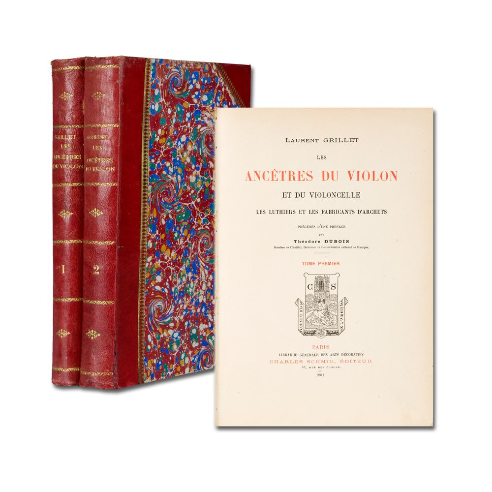 GRILLET, L.: Les Ancêtres du Violon et du Violoncelle les Luthiers et les Fabricants d‘Archets. Préface par Théodore Dubois. 2 Bde. Paris Ch. Schmid 1901 Quart. 1Bl. XXVII, 290 S. 1 Bl.; 409 S. zahlr. Faksimilies und Abb. Rote Halblederbände der Zeit. Ecken und Kanten etwas berieben und bestoßen, Gelenke leicht angeplatzt; sonst gutes Exemplar.