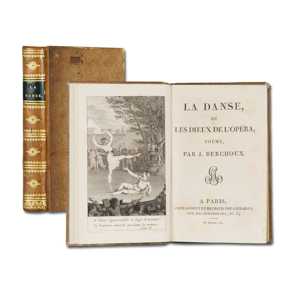BERCHOUX, J.: La Danse, ou les Dieux de l'Opéra Poème. Paris, Giguet et Michaud 1806. Duodez. Gestochenes Frontispiz von P. Baquoy nach S. Myris, 246 S. Halblederband der Zeit mit reicher ornamentaler Rückenvergoldung.