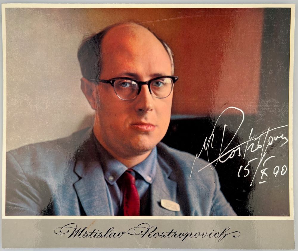Porträt des weltberühmten Cellisten und Dirigenten in jungen Jahren. - Rostropowitsch war, nachdem er 1971 Alexander Solschenizyn bei sich aufgenommen hatte, beim sowjetischen Regime in Ungnade gefallen. 1974 verließ er sein Land und wanderte in die USA aus. Dort wurde er Chefdirigent in Washington D.C. Die Widmung stammt aus dem Jahr 1990 in dem er durch Michail Gorbatschow die 1978 aberkannte sowjet. Staatsbürgerschaft und seine Rechte zurückbekam. - Portrait of the world-famous cellist and conductor in his younger years. - Rostropovich had fallen out of favor with the Soviet regime after taking in Alexander Solzhenitsyn in 1971. In 1974, he left his country and emigrated to the United States. There he became chief conductor in Washington, D.C. The dedication dates from 1990, when Mikhail Gorbachev restored his Soviet citizenship and rights, which had been revoked in 1978. The dedication is from 1990, when Mikhail Gorbachev restored his Soviet citizenship and rights.