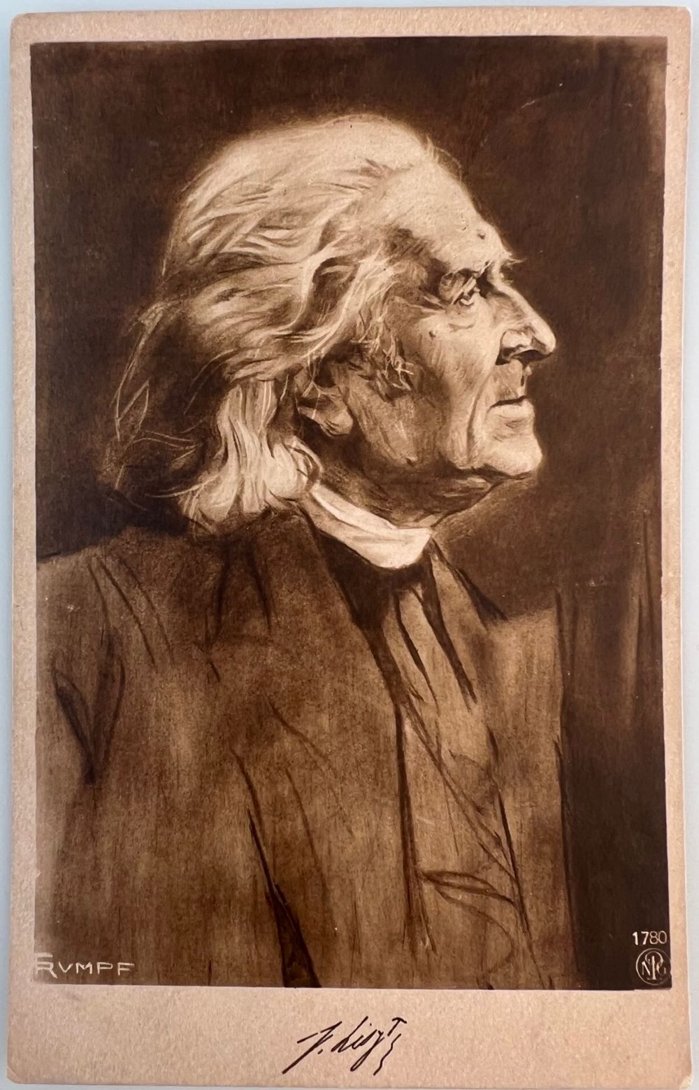 LISZT, Franz. - Portrait. Porträt. Brustbild nach rechts mit faksimilierter Unterschrift. Foto-Reproduktion einer Zeichnung von Fritz Rumpf [1882-1949]. [Ca.1915] 14 x 9 cm.
