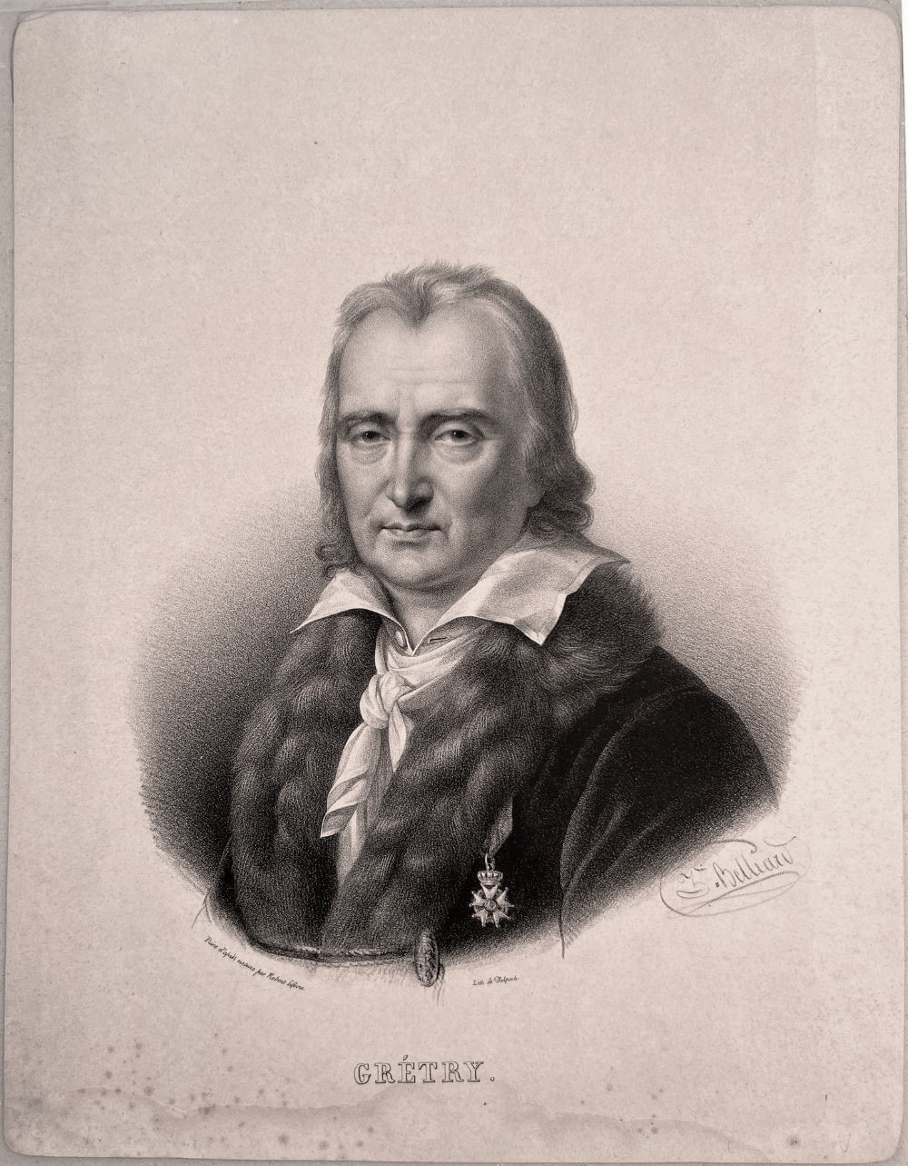 Ausdrucksvolles Porträt. Grétry trägt seine Medaille der Ehrenlegion. Grétry war der vielseitigste, produktivste und erfolgreichste Opernkomponist Frankreichs Ende des 18. Jhdts. Er schrieb mehr als 60 Bühnenwerke. Auch als Musikschriftsteller machte er sich einen Namen. - Thieme-Becker III, 250 (zu Belliard). - Siehe Abbildung.