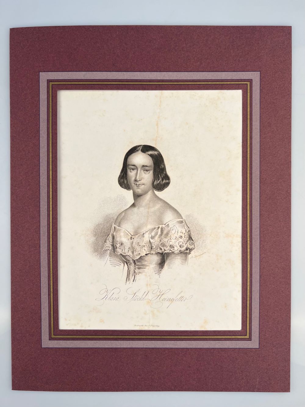 STÖCKL-HEINEFETTER, Klara. - Portrait. Porträt. Brustbild nach links. Stahlstich von A. Dworzack. Wien Feyertag [ca. 1850] 26,2 x 19,5 cm. Knickfalte. Etwas stockfleckig.