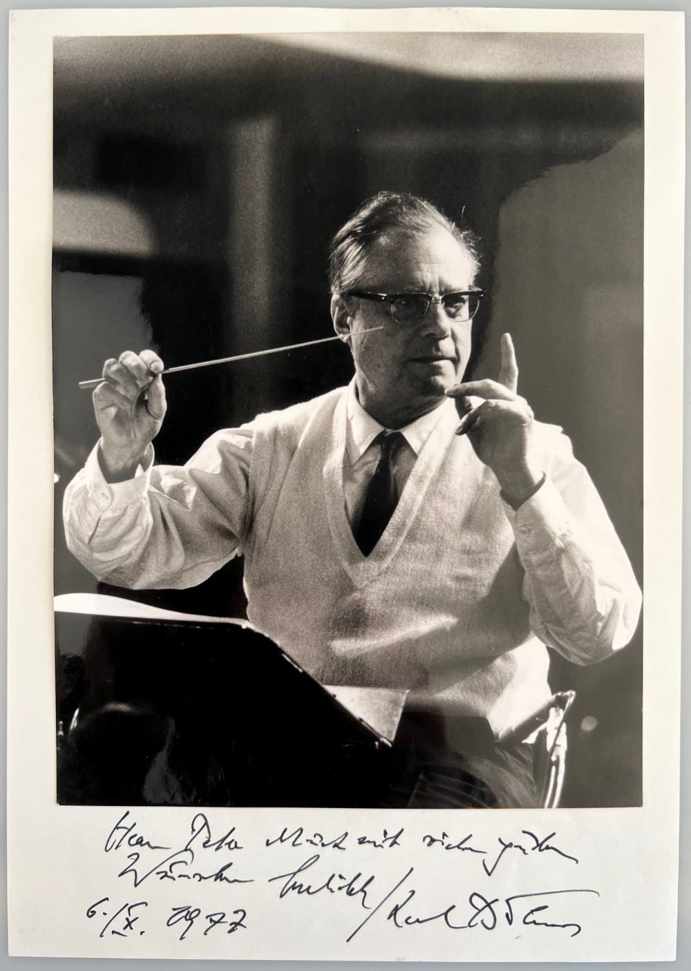 BÖHM, Karl [1894-1981]: Porträtfotografie mit eigenhändiger Widmung, Datierung und Unterschrift. - Portrait photograph with autograph dedication, dating and signature. [Berlin] 6.10.1977 29,5 x 21 cm. Foto: 23,8 x 18, 2 cm.