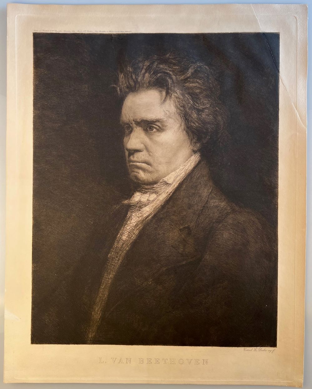 BEETHOVEN, Ludwig van. - Brustbild Portrait nach links. Radierung, Etching von Carel Lodewijk Dake. Brüsssel Dietrich & Cie. [ca.1889] 47,5 x 37,5 cm. Crease at upper right margin inconspicuously repaired. - Knickfalte am oberen rechten Rand unauffällig repariert.
