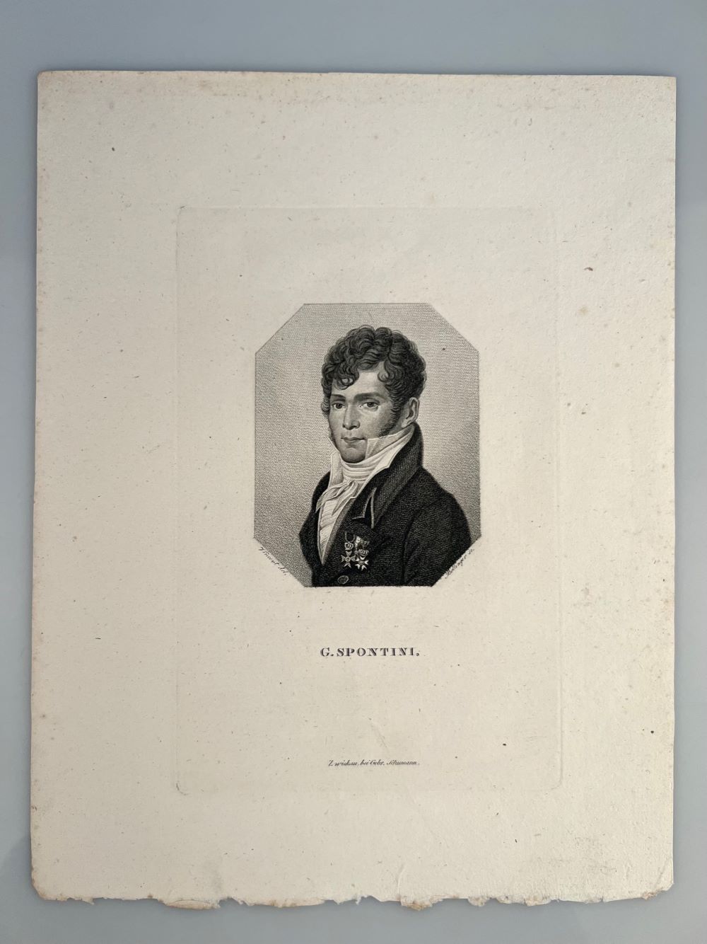 Das Porträt entstand nach dem Gemälde von A. P. Vincent und zeigt Spontini im Galarock im Alter von etwa 45 Jahren.