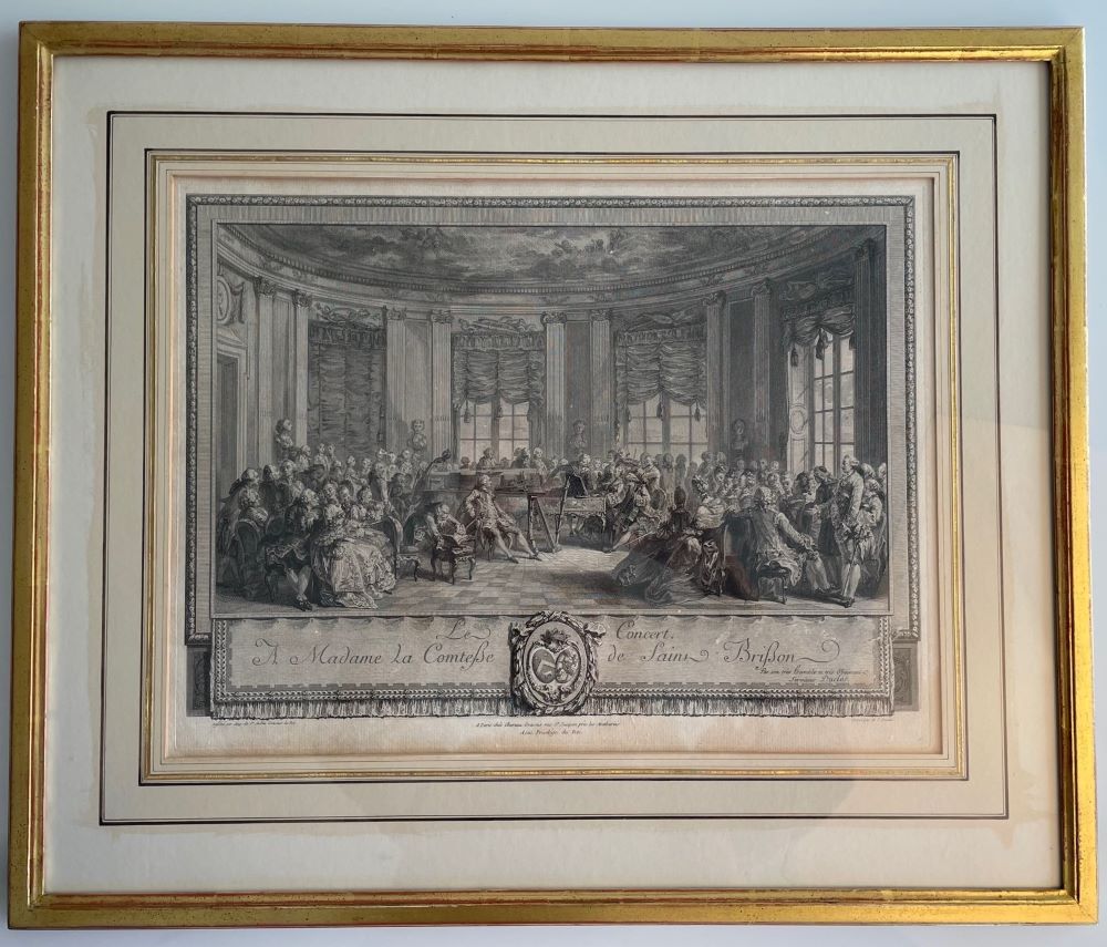 SAINT-AUBIN, A. de: "Le Concert". Radierung und Kupferstich von A. J. Duclos nach A. de Saint-Aubin. [1774]. 32 x 43 cm. Kleine Beschädigung am rechten Blattrand. Unterer Blattrand leicht gebräunt. Unter Passepartout in Goldrahmen.