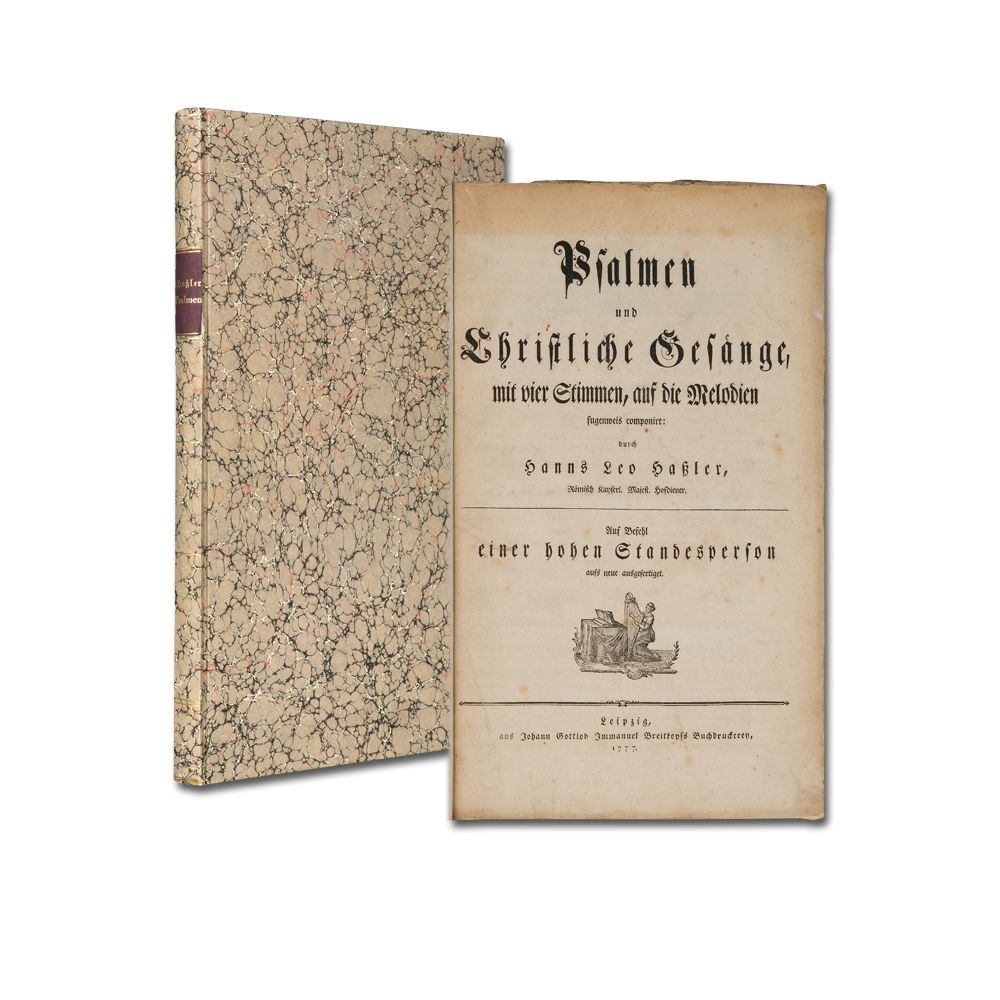 HASSLER, H. L.: Psalmen und christliche Gesänge, mit vier Stimmen, auf die Melodien fugenweis componirt. ... Auf Befehl einer hohen Standesperson aufs neue ausgefertiget [von J.P. Kirnberger]. In Typendruck. Leipzig, J.G.I. Breitkopf 1777. Folio. 2 Bl., 150 S., 1 Bl. (Register). Papierbedingt etwas gebräunt. Unbeschnitten. Pappband im Stil der Zeit.