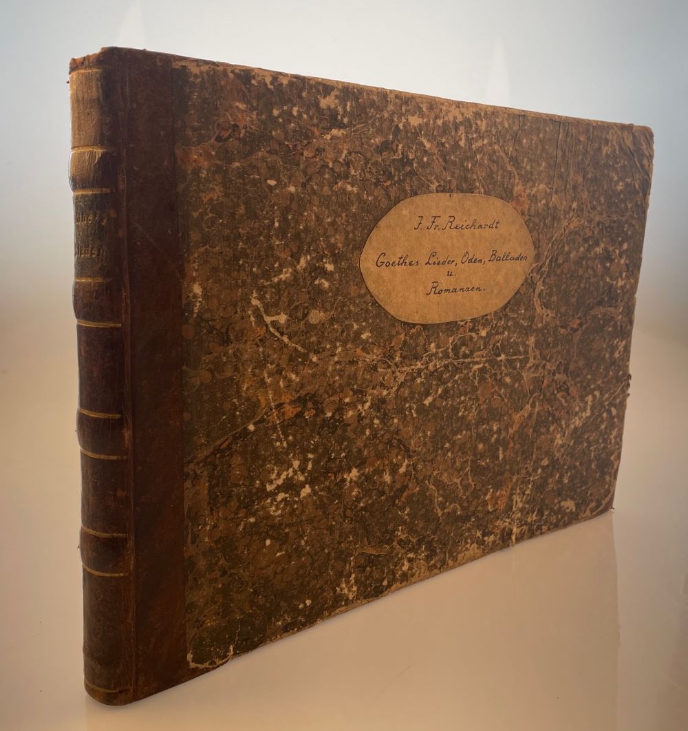 REICHARDT, J. F.: Goethe's Lieder, Oden, Balladen und Romanzen ... erste, (zweite dritte) Abtheilung. Leipzig Breitkopf & Härtel, (PlattenNr. 1411, 1412, 1413) [1809] Quer-Folio, 3 Hefte in einem Band, 3 Bl., 50 S., 2 Bl., 62 S.; 2 Bl., 29 S., 1. Titel mit einer verstärkten Blattecke, einige Seiten leicht stockfleckig. Halblederband der Zeit. Gebrauchsspuren.