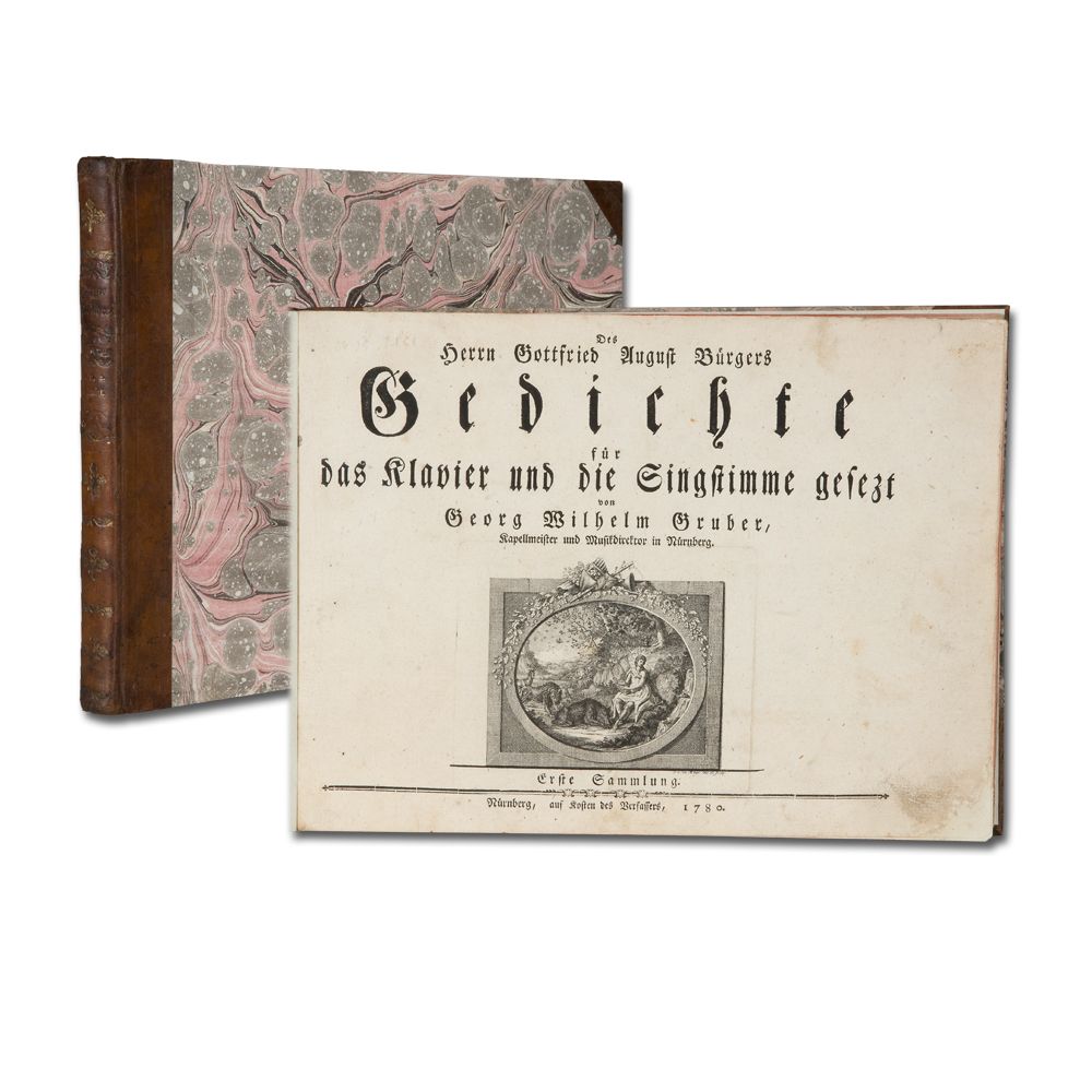 GRUBER, G. W.: Des Herrn Gottfried August Bürgers Gedichte für das Klavier und die Singstimme gesetzt. Erste (und Zweyte) Sammlung in einem Band. Nürnberg, auf Kosten des Verfassers 1780. Quer-Quart. 2 Bl., 47 S., 2 Bl., 52 S. Text mit gegenüber gestellten gestochenen Musiknoten; Titelseiten mit Vignette von J. C. Mayr; Holzschnittvignetten im Text. 10 Blatt mit angeränderten Ecken. Vorsätze erneuert. Wenige Blatt leicht fingerfleckig. Halblederband der Zeit mit zeitgenössischem Buntpapier.