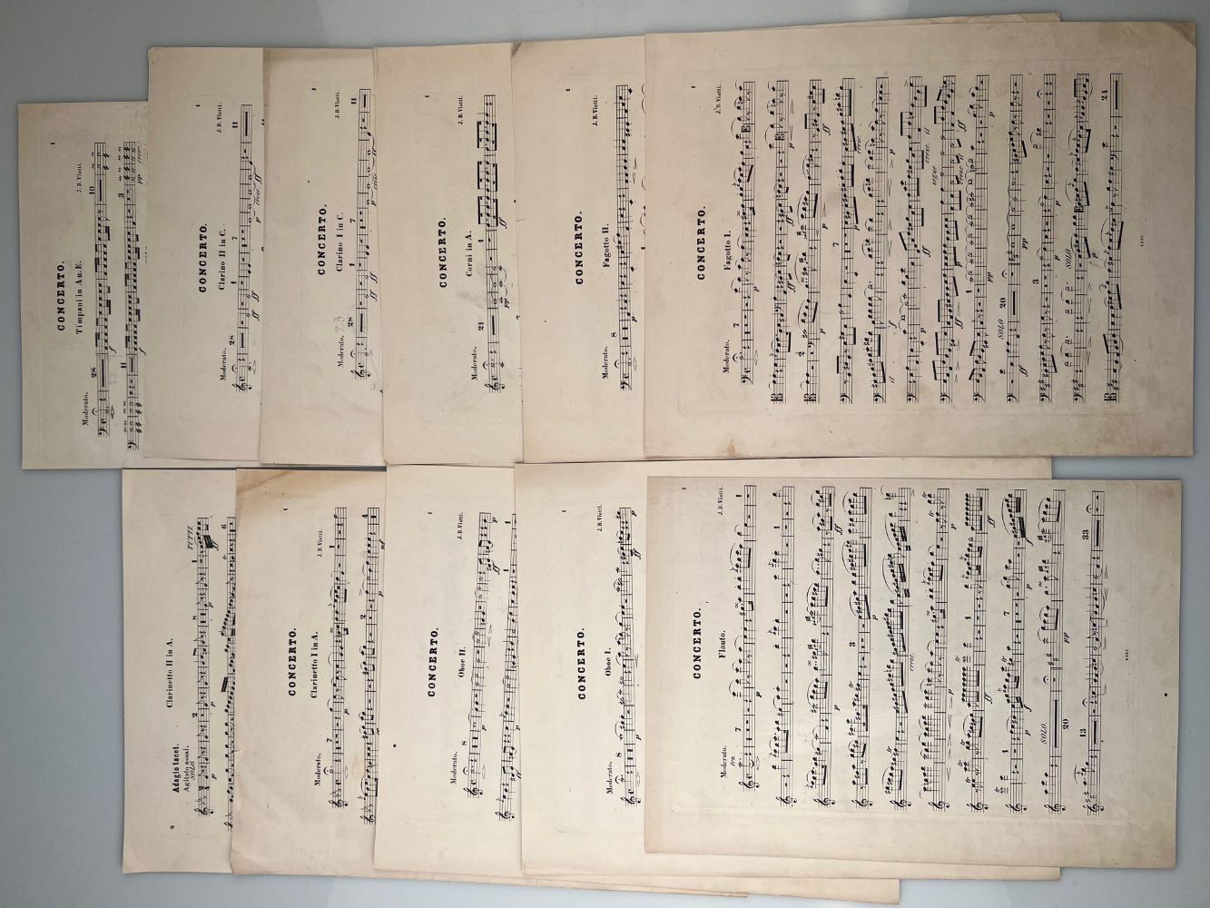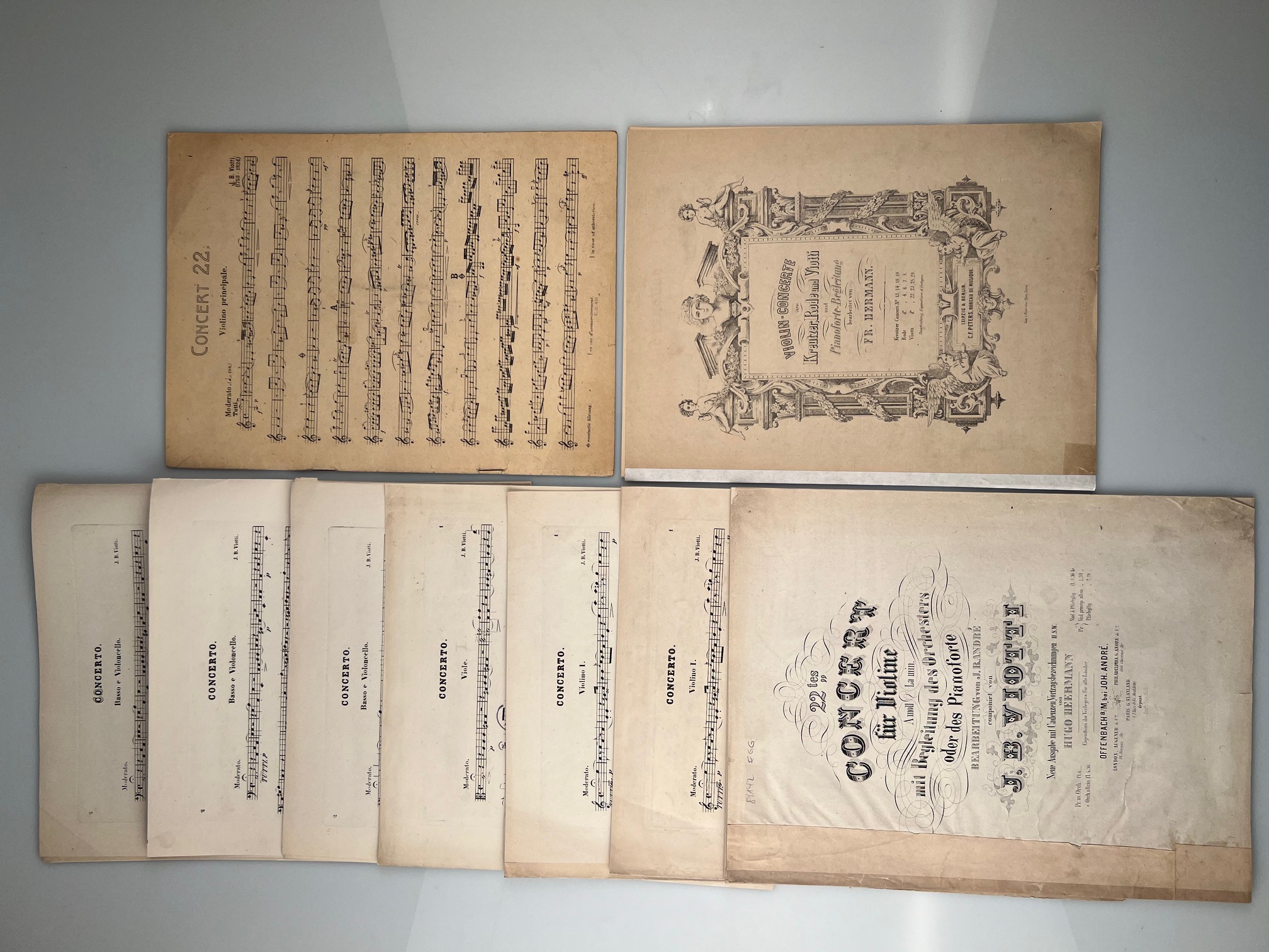 VIOTTI, J. B.: 22tes Concert für Violine A-moll mit Begleitung des Orchesters oder des Pianoforte. Bearbeitung von J. B. André. Neue Ausgabe mit Cadenzen, Vortragsbez. u.s.w. v. H. Heermann. [Orchesterstimmen, Solostimme und Klavierbegleitung] Offenbach André (PlattenNr. 4357) [1822] Folio. Einzelstimmen für Fl, OB 1+2, Kl 1+2, Fag 1+2, Horn, Trp 1+2, Timp, 3x Vl 1, Vl.2 fehlt, Viola, 3x Bass/Cello. Beigefügt: Solostimme, UE (VerlagsNr. 47a), 12 S. und Pianoforte-Begleitung, Peters (VerlagsNr. 3860), 21 S.