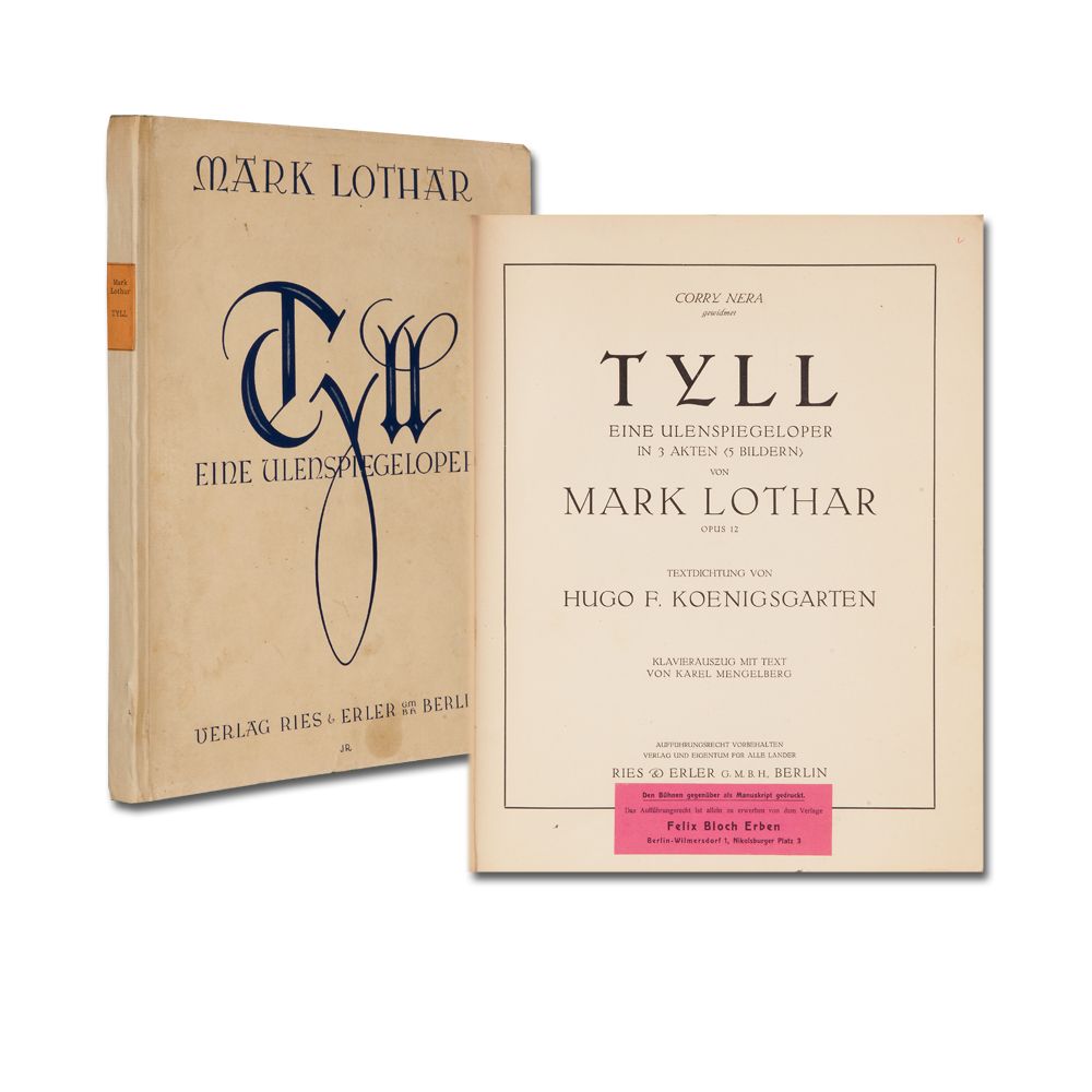 LOTHAR, M. [eigentl. Lothar Hundertmark]: Tyll. Eine Ulenspiegeloper in 3 Akten (5 Bildern). Op. 12 Textdichtung von H. F. Koenigsgarten. Klavierauszug mit Text von K. Mengelberg. Berlin, Ries & Erler (VerlagsNr. R 9716 E) (1928). Folio. 254 S. OKt. Leicht fleckig.