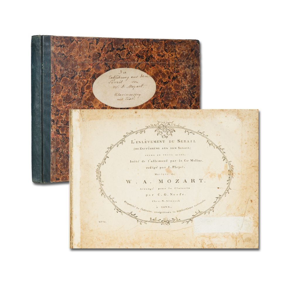 MOZART, W. A.: L'Enlèvement du Serail (die Entführung aus dem Serail) Opera en trois Actes. Imité de l'allemand par le Cen Moline, redigé par I. Pleyel. ... Arrangé pour le Clavecin par C. G. Neefe. (Text frz./dt.) [KV 384]. Bonn N. Simrock (PlattenNr. 76 vereinzelt mit Stichfehler 67) [1799] Quer-Folio. 1 Bl., 151 S., Eintragungen in Blei. Titelstelle mit Differenz in der Bräunung durch ein abgelöstes Papierschild mit Textverlust der Peisangabe, kl. Einriss hinterlegt, knittrig, stockfleckig. Halbleinenband mit zeitgenössischem Buntpapier.