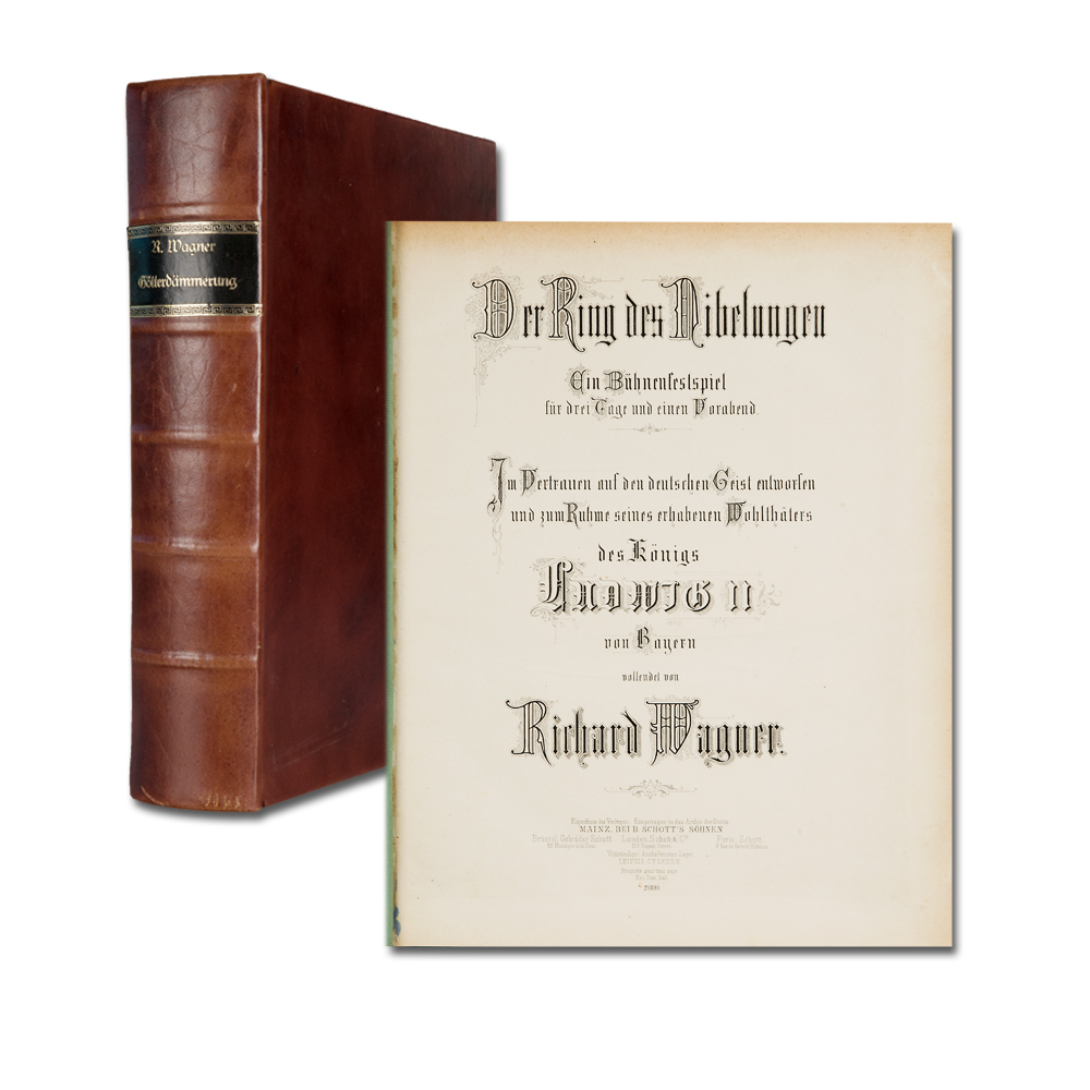 WAGNER, R.: Der Ring des Nibelungen. Ein Bühnenfestspiel für 3 Tage und einen Vorabend. (Dritter Tag: Götterdämmerung). (Partitur). [WWV 86 C]. Mainz B. Schott's Söhne (PlattenNr. 21953) [26. Juli 1876] Folio. 4 Bl., 615 S. der 1. Aufzug mit Eintragungen eines Dirigenten in Blei, teilweise Tinte. 21/04 Schöner Ganzlederband im Stil der Zeit.