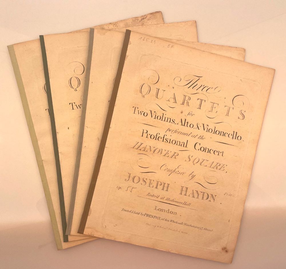 HAYDN, J.: Three Quartetts for Two Violins, Alto, & Violoncello. performed at the Professional Concert Hanover Square. [Op. 55]. Stimmen. London Preston [ohne PlattenNr.] [ca. 1810] Quart. 19, 19, 19, 15 S. Teils mit Feuchtigkeitsspuren, 1 Titel mit Namensstempel.