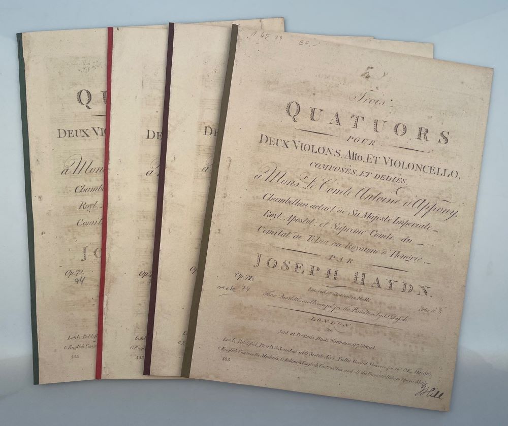 HAYDN, J.: Trois Quatuors pour Deux Violons, Alto, et Violoncello ... Op. 72 (recte Op. 74). Stimmen. London Preston's Music [PlattenNr. 535] [ca. 1810] Quart. 19, 19, 15, 13 S. 1 Titel mit Namenszug von alter Hand.