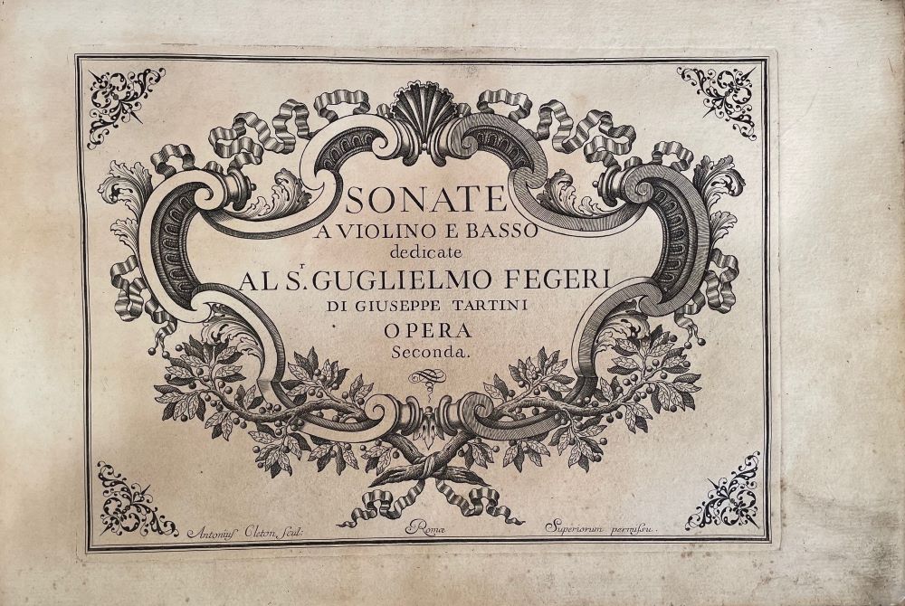 TARTINI, G.: (12) Sonate à violino e basso ... Opera Seconda. [Partitur]. Rom, Antonius Cleton (ohne PlattenNr.) (1745) Folio oblong - Quer-Folio. Engraved title - Kupfertitel, 1 f., 63 pp. Contemporary paperback. Spine inconspicuously repaired - Pappband der Zeit. Rücken unauffällig repariert.