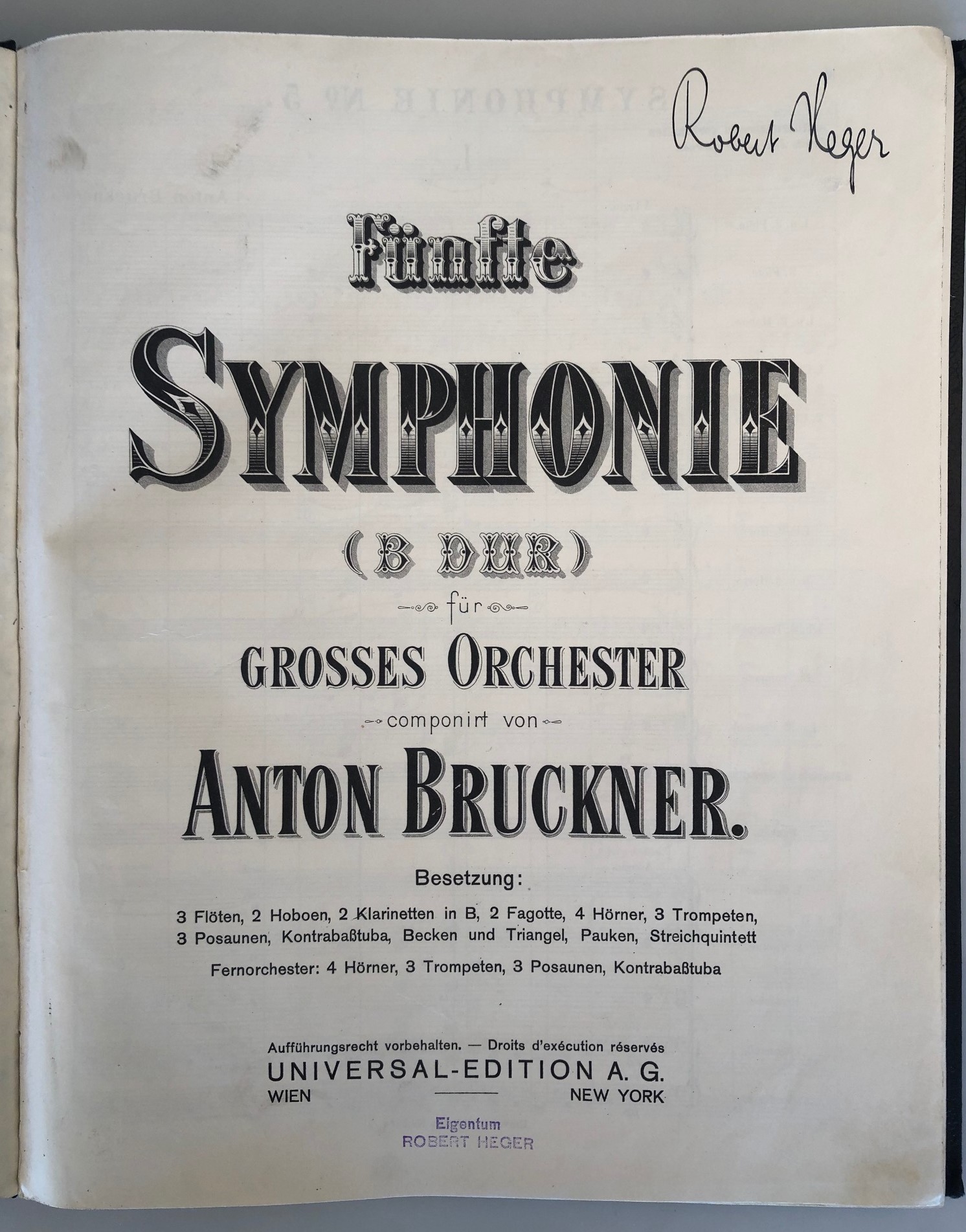 BRUCKNER, A.: Fünfte Symphonie (B Dur) für grosses Orchester. [WAB 105] Wien/New York Universal-Edition (VerlagsNr. U.E. 2884) [ca. 1910] Folio. 171 S. Titel mit Namenszug und Besitzerstempel. Ln.